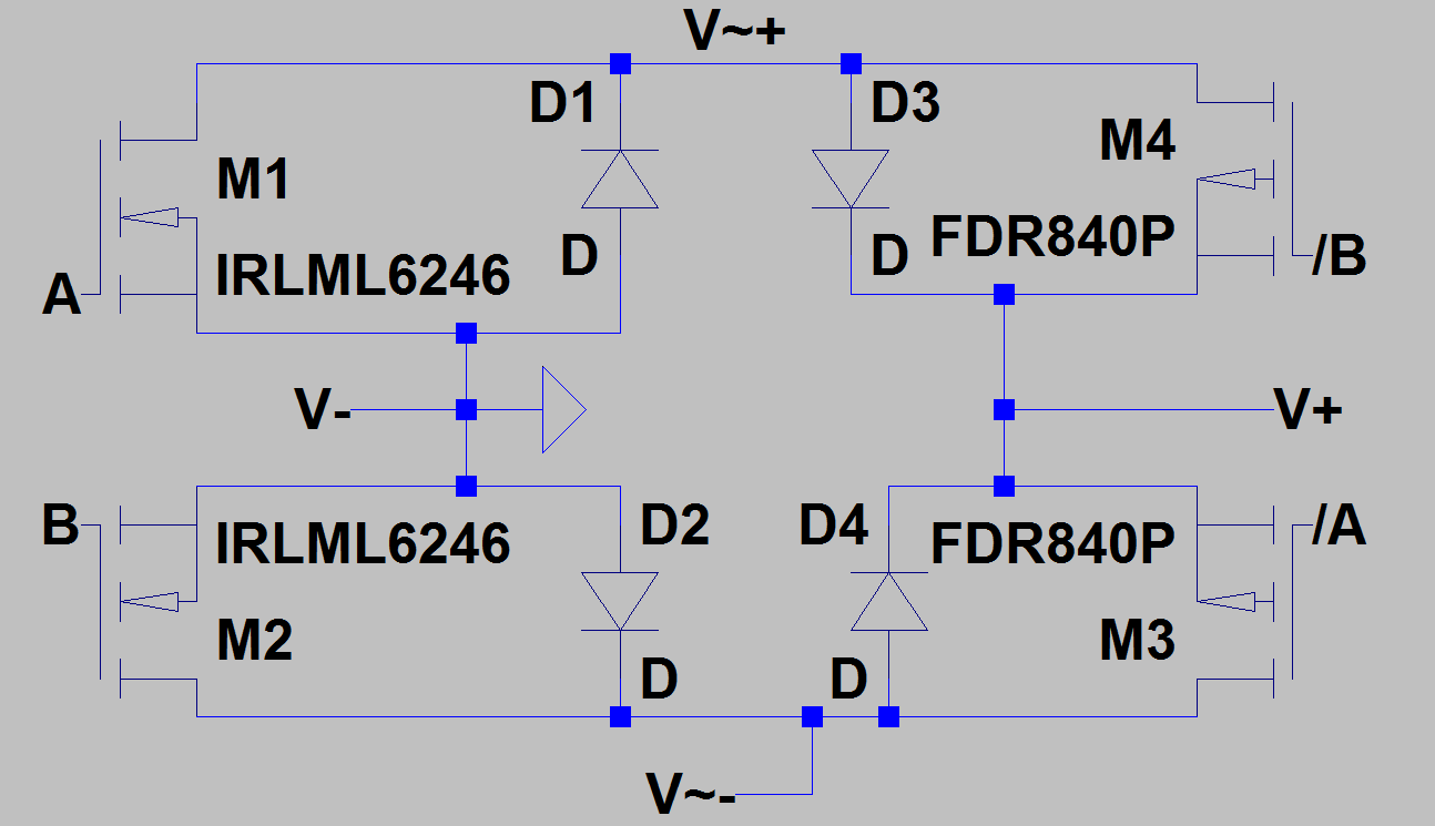 Spannung (und damit Strom) an den Bodydioden messen und entsprechend einschalten. Es gibt dafür fertige ICs(Spannung, Frequenz, Gatestrom beachten). Oder selbst bauen, wenn man glaubt besser zu sein;) Funktioniert in Resoanzwandler aller Art(welche auch induktive oder kapazitive Phasenverschiebungen haben können) recht gut. Erklär mal, warum man das am Fahrrad brauchen sollte. Wieder mal den Generator Synchrongleichrichten mit der Hoffung weniger treten zu müssen?