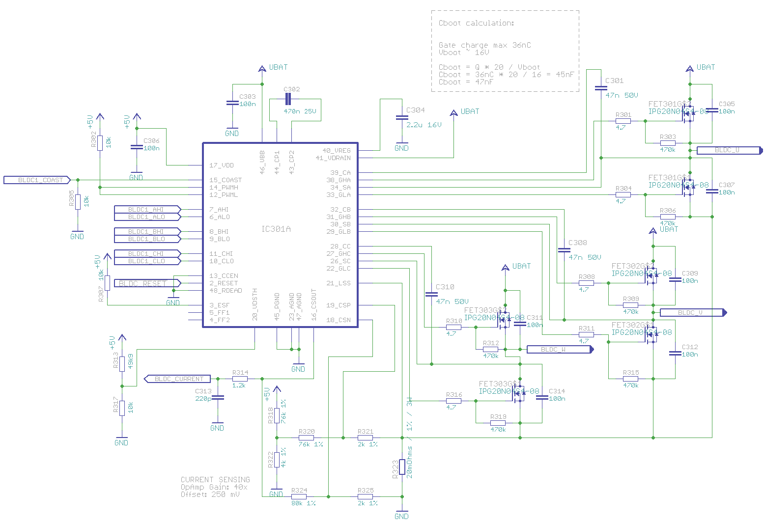 Hallo zusammen, ich habe ein kleines Problem mit einer BLDC-Ansteuerung mit dem Allegro A4935. Eine Zeit lang haben die Schaltungen, ich habe drei Stück im Einsatz, wunderbar funktioniert. Aber dann ist bei einer, allerdings steuert diese den größten Motor an, ein Fehler aufgetreten. Teilweise waren die MOSFETs defekt (es sind Infineon IPG20N04S4-08 Dualfets) und auf Verdacht wurde auch der Treiber getauscht. Jetzt ist nur mehr das Problem, dass ich die Ursache herausfinden muss bzw. einen weiteren Defekt verhindern will. Ich habe diese Schaltung, nur mit stärkeren FETs (Vishay SQM120N04) und größerem Motor, schon seit längerem im Einsatz. Schaltungstechnisch sind nur die Werte des Cboot unterschiedlich und bei der aktuellen Schaltung habe ich weniger Stabi-ELKOs bei der Versorgung (Ubat ist nominell 24V, also so rund bis 29V). Habt ihr vielleicht Ideen, worin die Probleme bestehen könnten? Ich vermute in Hinblick der ersten Schaltung mit anderen FETs, die problemlos funktioniert, dass es etwas mit den kleineren FETs bzw. der Dimensionierung zu tun hat?
