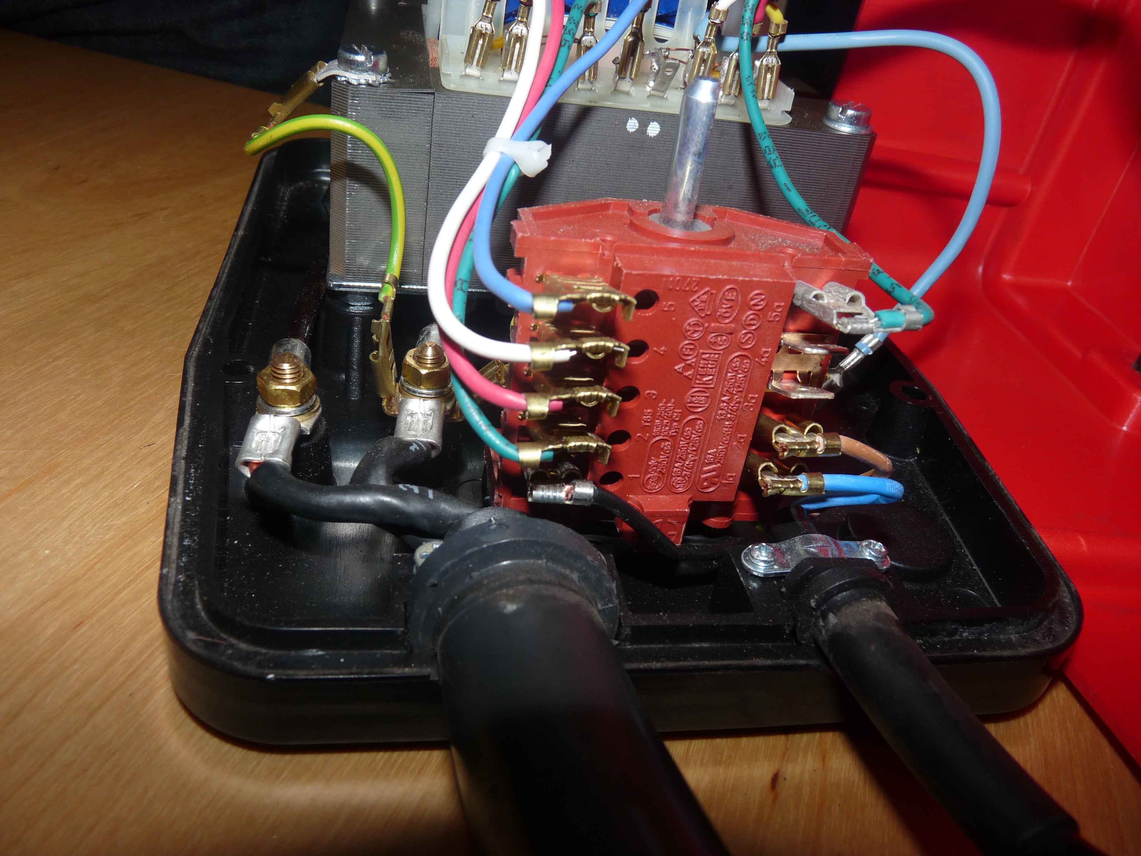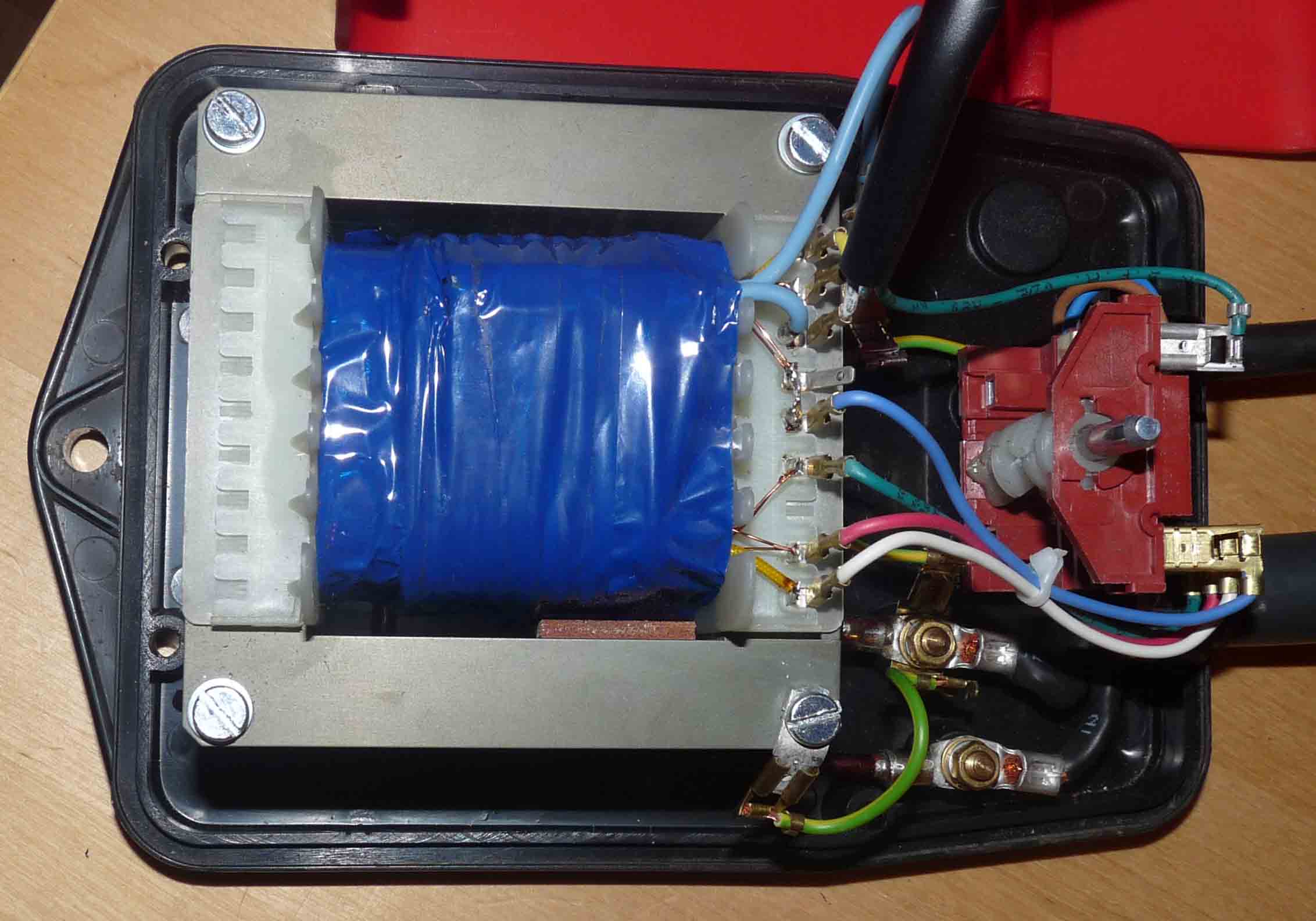 Das ist die seit Jahrzehnten übliche Technik um an LKW Reifen das Profil nachzuschneiden. Die Umschaltung am Trafo erfolgt primärseitig um nicht die vollen 13A über den Schalter führen zu müssen.
