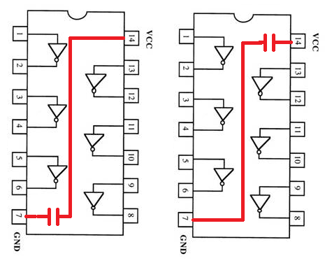Obwohl es doch eagl sein sollte wo der Kondensator auf einer kürzesten Linie zwischen Masse und VCC Pin des ICs sitzt. Siehe Bild (Vorlage geklaut von http://student.olivetcollege.edu/moladele/Board4_files/image008.jpg)