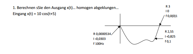 Ich würde das Ganze so angehen: Die Ortskurve gibt eine Übertragungsfunktion in abhängigkeit von der Frequenz an: H(f) Um an das Ausgangssignal zu kommen, muss ich Eingangssignal x H(f) rechnen. Da dein Eingangssignal recht einfach ist (nur eine Frequenz) kann man H(f) für diese Frequenz aus der Ortskurve bestimmen. Nur noch rechnen un fertig.