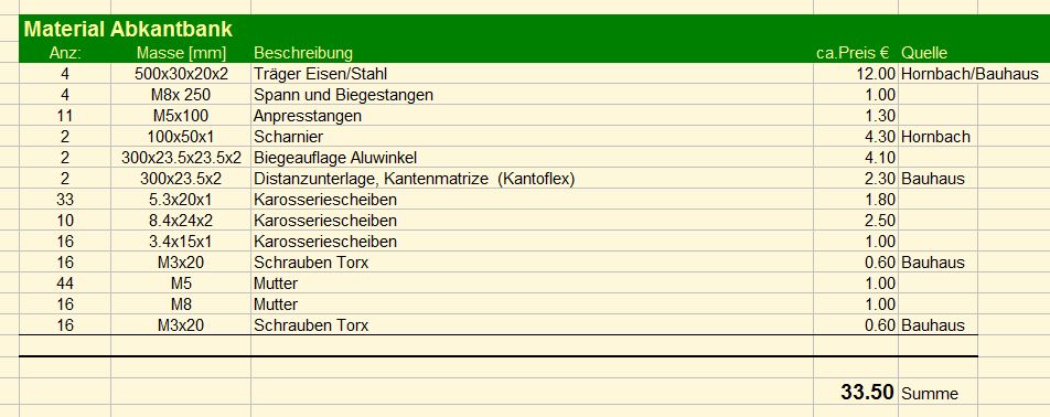 MaWin schrieb: > Ein etwas einfacherer Weg ist ein 90 Grad V-Profil mit Oberteil Naja,einfacher ist dieser Weg über Prisma und Biegestempel nicht und ohne Spindelpresse wird das auch nix.Außerdem kommt man ohne diverse Stempelvarianten nicht aus(Fensterstempel ctc.) um Mehrfachbiegungen zu machen.Das Biegeergebnis schaut schon recht gut aus.Ob das über die gesamte Breite zu halten ist kann ich nicht sagen.Aber sonst kann man nicht meckern weil mit wenig Maschineneinsatz gebaut.Gratulation.Mir geht es im Prinzip auch immmer so ,das die Hauptaufgabe darin besteht Dinge mit wenig Werkzeug und unter Verwendung fertiger günstiger Teile zu bauen.Da glaube ich liegt die hohe Schule der Mechanik ...weil wie es mit einigen Maschinen zu machen wäre ist da schon sehr viel einfacher.