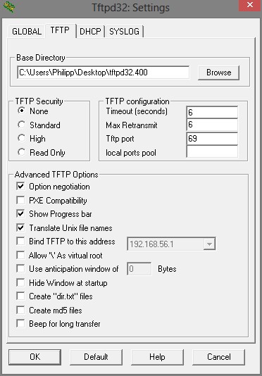 Hallo nochmal zusammen, ich habe heute noch etwas weiter experimentiert, aber die richtigen Einstellungen für TFTPD32 habe ich immer noch nicht gefunden. Könnte jemand bei dem das läuft kurze Starthilfe geben? Grüße Philipp