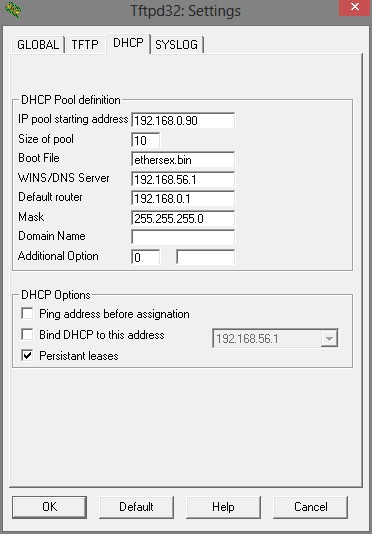 Ich habe bei mir kein DHCP eingetragen, sondern nutze das der Fritzbox, gebe in Ethersex nur die IP des Windows-TFTP-Servers an. Sonst sind meine Einstellungen ähnlich, bei Security habe ich "Standart" Grüße Klaus