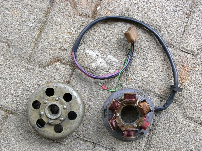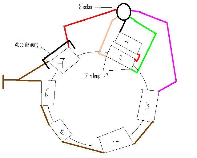 Hallo Ich habe oben mal ein paar Bilder der Zündung die mir am meisten Kopf zerbrechen macht. Ich denke das Spule 1 und 2 den Zündimpuls erzeugen wenn eine abgeknickte lücke zwischen 2 Magneten erst über 1 und dann über 2 geht. Aber wo messe ich den Impuls? Und wie sieht der dan ungefähr aus? Und vorallem warum??? Das sind sie kleinen Roten auf dem Foto, man sieht aber nur die obere. 3 - 6 sorgen glaube ich für Licht und 7 ist Batterieladung oder? Allerdings hängt an 7 der Drehzahlmesser dran, wobei ich glaube das der nichts anderes macht als ein Voltmeter. Der misst einfach nur die steigente spannung bei steigender Drehzahl. Wenn ich die tastköpfe für mein Oszilloskop habe kann ich die Impulse auch genau messen, immo hab ich nur ein Multimeter. Sorry wenn ich ganz von vorn anfange, aber das Zündungssteuerteil soll ja auch funktionieren .