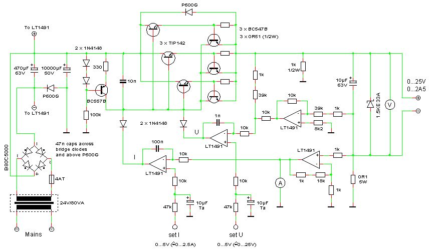 Moin Mario, hier mal ein Schaltungssausschnitt aus einem Selbstbau Labor-Netzgerät. Statt OPV-Regler hier den T4 als Regler. (OP-Amps waren z. Zt. des Aufbaus seltener u. teuer). Über dem Regeltransistor, genau wie für den OPV vorgeschlagen, ein C v. 1 nF zur Unterdrückung v. Regelschwingungen. Div. weitere Kondensatoren in der Schaltung, die zum Abblocken v. Hf-Einstreuungen dienen. Soll´s geben, wenn ein KW-Transceiver in einem Meter Abstand daneben steht oder die Antennen eines 1 MW-Mittelwellensenders in der Nähe sind. (nicht mit der Giesskanne verteilt!!)