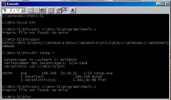 Guten Abend (oder besser guten Morgen) allerseits. Ich hab hier seit 2 Stunden ein "Problem" das ich nicht gelöst bekomme. Ich wollte für einen jungen Menschen (mit richtig wenig Geld) mein altes Win98 Notebook fit machen damit man darauf mit dem SDCC Compiler die 8051 und die AVR Familie programmieren kann. Den AVR-GCC konnte ich gut installieren. Allerdings: erstens kommt es anderst und zweitens als man denkt, denn Eigentlich hatte ich angenommen gehabt, dass der ältere SDCC auf einem Win98 System noch gut laufen müßte. Pustekuchen. Ich konnte das SDCC-Paket gut installieren, keine Fehlermeldung nichts... und ich kann auch den Compiler selbst starten. Nuuuuuur: Wenn ich eine Datei übersetzen will "spinnt" der Präprozessor... Die Pfade sind gesetzt, die einzelnen Programme des Pakets werden gefunden, nur scheinbar funktioniert der Datenstrom vom Compiler zum Präprozessor nicht. Woran könnte das liegen? Für Hinweise bin ich sehr dankbar (ansonsten kann der junge Mensch dann leider nur die AVR Sachen ausprobieren, ich denke allerdings dass es zum Verständnis der Mikrocontroller und der Prozessoren es besser wäre, man bringt ihm die "alte Welt" der Prozessoren bei) Gruß, Ralph PS: die Vorgehensweise bei der Installation hat so wie ich sie vorgenommen hatte bei Windows 2000 / Windows XP und Windows 7 (64 Bit) geklappt ... nur eben mit Win98 nicht !!! Und nein, ich mag kein anderes System darauf installieren, es ist ein K6-400 MHz mit 256 MB Ram