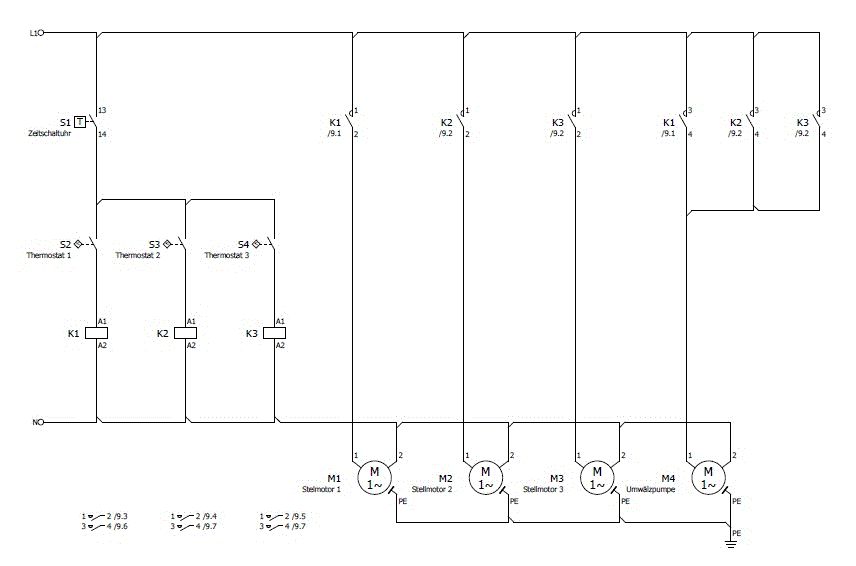 Vorrausgesetzt das Ganze läuft komplett mit 230VAC und Du kennst die Kontaktbelastbarkeit deiner Thermostate nicht, würde ich das so wie im Anhang aufbauen. Vorteil: Die Schaltkontakte Deiner Thermostate und der Zeitschaltuhr sind nicht mehr im Lastkreis und haben keine Leistung mehr zu schalten. Als Schütz sowas hier: http://www.conrad.de/ce/de/product/502378/Siemens-SIRIUS-3R-Schuetz-3RT1-Siemens-3RT1016-1AP01-1-Schliesser-S00-230-VAC/SHOP_AREA_84256&promotionareaSearchDetail=005 Edit: Bei der Auswahl der Schütze auf die Leistung achten, die diese schalten können.