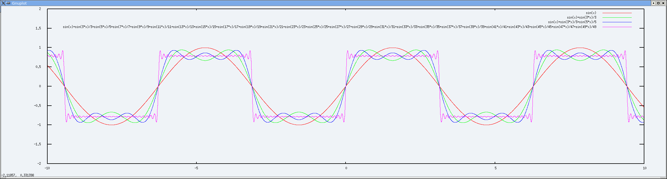 Der Typ hätte sich entweder vielleicht mal mit der Fourieranalyse auseinander setzen sollen oder er ist schlicht Verkäufer. In diesem speziellen Testsignal sieht es doof aus, anschaulicher wäre es, den 1kHz Sinus weg zu lassen. Die 'Störungen' sind nämlich hohe Frequenzen, welche korrekterweise aus dem Nutzsignal entfernt wurden. Dazu muß man wissen, das sich ein Rechteck aus unendlich vielen Oberschwingungen zusammensetzt: Der Grundwelle (sin(x)) und Oberwellen (sin(n*x)/n) Also Rechteck = sin(x)+sin(3*x)/3+sin(5*x)/5+sin(7*x)/7 ... usw. Also alle ungeraden Oberwellen mit abnehmender Amplitude. Wenn man dies also bis in die Unendlichkeit durchrechnet erhält man ein Rechteck. (im Bild: Grundwelle, bis 3. Oberwelle, bis 5. OW und bis 49. OW) Gerade digitale Systeme können Signale aber nur bis zu einer gewissen Frequenz abtasten und auch wiedergeben. Versuchen zu wollen, einen perfekten Rechteck abzutasten kann eigentlich nur in die Hose gehen. Begrenzt man nun die Frequenz, erhält man also auch nur einen Rechteck, welcher nur bis zu einer bestimmten Frequenz Oberwellen enthält. Zu versuchen, diese Frequenzen mit zu übertragen ist Mumpitz! Man handelt sich damit nur Störungen ein. Selbst wenn nur ein Rechtecksignal bei ihm gewandelt wird, wird es nie so sein, daß die Flanken an der richtigen Stelle sitzen. Denn während das Rechtecksignal zu jeder Zeit eine Flanke haben kann, ist die digital gesamplete Zeit gerastert - quantisiert. D.h. mal wird die Flanke noch bei dieser Wandlung, mal eine Wandlung später gewandelt. Man bekommt also gar kein reines Rechtecksignal mehr heraus, sondern etwas mit sich ständig ändernder Pulsweite. Und so bekommt man eine schöne, pulsweitenmodulierte Störung auf sein Signal. Also: Was der da zeigt, sieht zwar schöner aus, ist aber für Audio absoluter Quark. Gruß Jobst