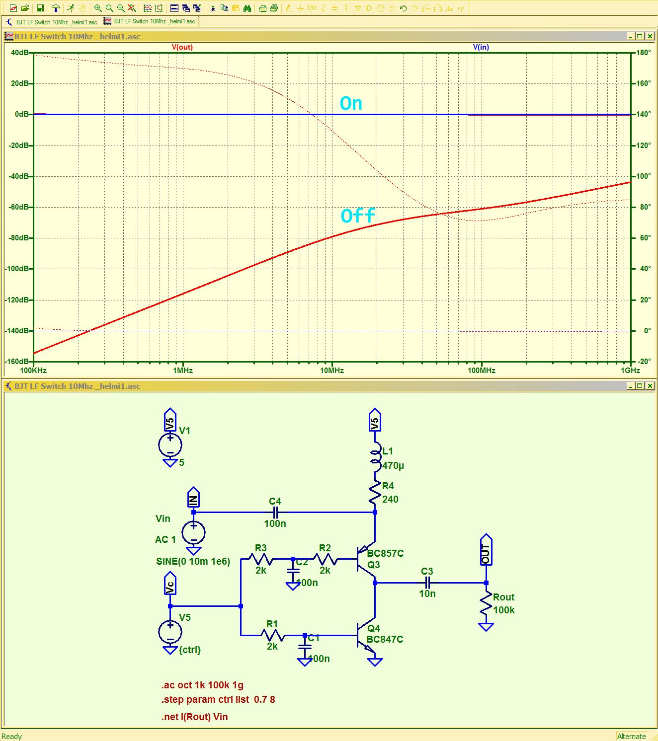 OT: HF Schalter aus helmi1's Quarzfilterschaltung Ich hab mal spasseshalber den HF Schalter aus filter.png simuliert .... falls es jemanden interessiert. Im 2.ten Anhang ist eine etwas verbesserte Version mit höherer Isolation und im 3.ten eine Version aus dem HP4195A Speki.