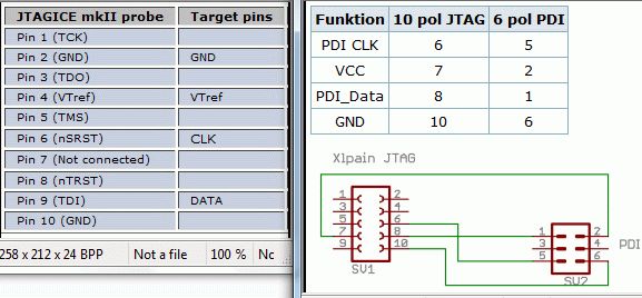 Leider unterstützen nicht alle JTAGice MKII den vollen PDI-Funktionsumfang, klär vorerst ab, ob du ein Gerät mit der richtigen Serie-Nr. hast. http://www.atmel.com/Images/doc8169.pdf Auch die genauen Steckerbelegungen sind dort verzeichnet. Hans Peter