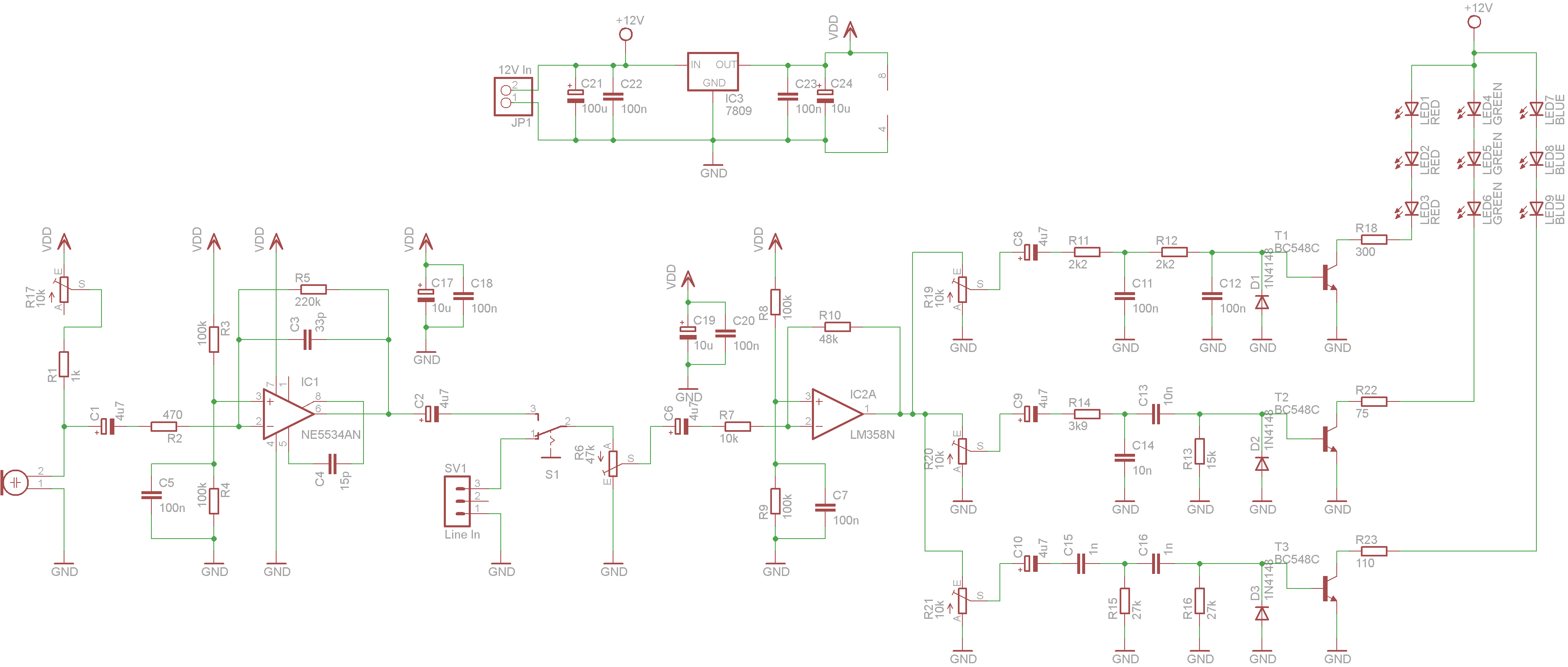 Hi, ich bastel gerade an einer LED-Lichtorgel. Sie soll auf Lochraster aufgebaut werden und mit einem einfachen 12V Netzteil betrieben werden. Je nach Situation soll sie mit einem eingebauten Elektretmikrofon oder über eine 3.5mm Klinkenbuchse angesteuert werden. Für drei Frequenzbereiche gibt es rote, grüne und blaue LEDs. Da es schon etwas länger her ist, dass ich das letzte mal was analoges designed habe, fänd ich es cool wenn ihr euch den Schaltplan mal anschauen könntet. Hab ich da irgendwelche Fehler drin? Vielen Dank schonmal im Vorraus. Viele Grüße Tobi