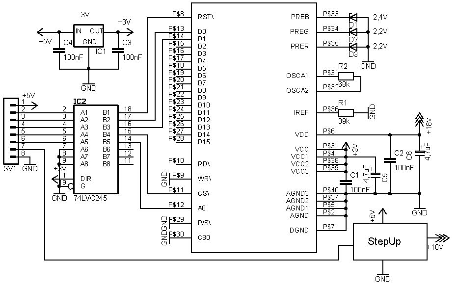 Obwohl ich selber Platinen ätzen kann, würde ich auch ein paar fertige für das OLEDs nehmen. Beim Ätzen der Platine für ein 0,5mm Raster habe ich nämlich deutlich gemerkt, wo die Grenzen sind. Vor allem lötet sich auf selbst geätzen Platinen mit stark variierenden Abständen zwischen den Pads auch schlecht.. Meine Idee zu den Platinen wäre: Wie machen eine Platine so in etwas wie mein Schaltplan (der zum größten Teil aus dem Datenblatt stammt), jeder kann dann entweder die Platine dazubestellen oder Platine + ICs + Spule für den StepUp (den 74LVC245 und den StepUp Regler und die Spule gibt es bei Reichelt nämlich nicht) bestellen. Den 8 poligen Anschluss könnte man so auslegen, wie auf einigen LCDs: Im Layout sowohl Löcher für 2,54mm als auch Pads für ein 1,27mm Folienkabel oder eine Nullkraftbuchse für ein Folienkabel. Leider ist sowas organisieren + Platinen irgendwo anfertigen lassen nicht mein Fachgebiet... Hat eigentlich jemand irgendeinen besseren Vorschlag für den StepUp als der orginale im Datenblatt ?