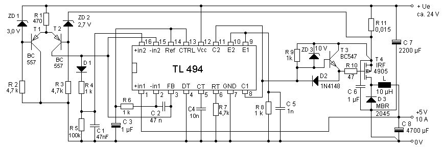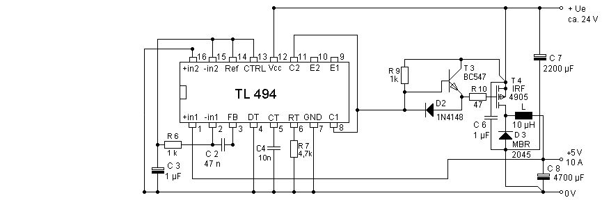 Im vollständigen Datenblatt vom 494 ist ein Step-Down-Wandler auf 5V aufgeführt. Die Strombegrenzung kannste weglassen, am Rest erkennst Du die Beschaltung des 494 eigentlich recht problemlos. Direkt am Feedback-Eingang rumspielen würd ich nicht empfehlen, sondern eine entsprechende Verstärkung mit den beiden Fehlerverstärkern, die der 494 an Bord hat. Du willst ja kein konstantes Tastverhältnis, Du willst eine konstante Ausgangsspannung... Ich häng mal ein Beispiel für so eine Schaltung mit dran. Davon kannste viele Teile wie die FET-Ansteurung 1:1 übernehmen, wenn Du keine Schutzschaltung brauchst kannst Du R11 und den kompletten Kram am 2. OPV weglassen. Dieser OPV muß dann aber so beschaltet werden, daß er den ersten nicht mehr beeinflussen kann, also den negativen Eingang auf Vref und den positiven auf Masse. Eigentlich macht diese Schaltung schon recht genau das was Du willst, mußt nur den Spannungsteiler für die Ausgangsspannung entsprechend anpassen. Bzw. einen an Pin 1 einfügen, die dargestellte Schaltung erzeugt mit 5V genau die Vref des 494 und braucht daher keinen Spannungsteiler.