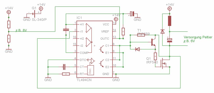 Du brauchst Dich da für nichts zu entschuldigen, Du hast einfach noch nicht verstanden wie die Regelung bei solchen Schaltungen funktioniert. Der 494 hat zwei Operationsverstärker eingebaut. Wenn man das so sagen will versuchen beide, ihre Ausgangsspannung so einzustellen, daß sich an ihren Eingängen ein Gleichgewicht ergibt. Die Ausgangsspannung (intern durch zwei Dioden geodert) liegt an Pin 3 an, der gleichzeitig der Eingang für den PWM-Block ist. Soll heißen, am negativen Eingang bekommt der OPV "vorgeschrieben" auf welche Spannung er einregeln soll (Sollwert), am positiven Eingang "fühlt" er, welche Spannung tatsächlich vorliegt (Istwert). Wenn der Istwert geringer ist als der Sollwert, gibt er einen niedrigen Spannungswert wieder aus, für den PWM-Block des 494 bedeutet das Vollgas. Wenn der Istwert höher ist als der Sollwert, gibt er einen hohen Spannungswert aus und der PWM-Block nimmt die Einschaltzeiten entsprechend weit zurück (bis auf komplett aus wenn nötig). Durch eine Gegenkopplung (recht hochohmiger Widerstand vom OPV-Ausgang auf seinen negativen Eingang) erzeugt man nun einen kleinen Zieh-Bereich, in dem der OPV ein Gleichgewicht an seinen Eingängen erreichen kann, wenn die Spannung am positiven Eingang in diesem Bereich liegt. Er regelt seine Ausgangsspannung und damit seinen negativen Eingang so nach, daß beide Eingänge gleiches Potential haben. Die dabei erzeugte Ausgangsspannung ist die eigentliche Regelgröße für das PWM-Verhältnis des Wandlers. Die 5V Referenz ist ein Ausgang, kein Eingang. Wenn Du eine stabile Ausgangsspannung haben willst, brauchst Du ja eine stabile Größe, mit der Du sie vergleichen und ggf. nachregeln kannst. Dafür sind die 5Vref da. Sprich wenn ich am Ausgang 8V haben will, stelle ich den negativen Eingang des OPV auf 5V ein (nicht fest auf 5Vref, sondern über einen kleinen Widerstand um noch eine Gegenkopplung aufbauen zu können) und an den positiven Eingang kommt ein Spannungsteiler, dessen Ausgangsspannung ebenfalls 5V beträgt wenn am Eingang 8V anliegen. Dein "Fehler" ist, daß Du im Moment versuchst alles was Dir hier von allen gesagt wird auf einmal zu verwursten. Jeder Plan, jedes Konzept hat Vor- und Nachteile. Einfach nur alle Vorteile zusammenkippen und die Nachteile unter den Tisch fallen lassen funktioniert nunmal nicht. Ein N-Kanal-FET würde eine komplett andere Treiberschaltung brauchen. Der öffnet nicht bei negativer Ugs wie ein P-Kanal-FET, sondern bei positiver Ugs. Nachteil ist, daß es bei dieser Variante kein richtiges Massepotential am Ausgang mehr gibt, die Messung der Ausgangsspannung wird halt entsprechend schwierig. Sowas würd ich nur bauen, wenn die Sollwervorgabe NICHT die Ausgangsspannung ist, beispielsweise wenn man dem 494 die komplette Temperaturregelung überlässt. Aber auf keinen Fall den Kondensator parallel zum Pelztier weglassen, das Ding braucht einen möglichst guten Gleichstrom und kein Dreieck wie vorgeschlagen.