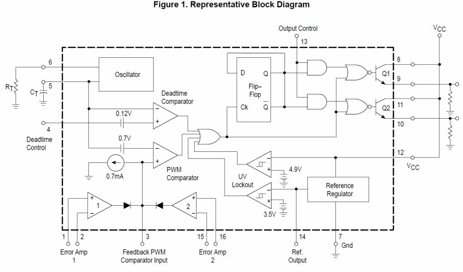 Ok... Ich habs mir nochmal durchgelesen, in der Hoffnung mit deinen Anmerkungen etwas mehr zu verstehen. Ich denke ich bin auf nem guten Weg. Dann habe ich aber direkt ein paar Fragen: 1. Was bringt mir der Gegentakt (im Datenblatt steht CTRL@5V-> push-pull), wenn ich eh beide Transistoren gleichschalte? Denn gerade im Gegentakt schalten die Transistoren ja zu unterschiedlichen Zeiten, oder nicht? 2. Die Emitter in der Luft hängen zu lassen is wahrscheinlich gaar keine gute Idee! > Vielleicht wäre es einfacher, die Ausgänge (C1/E1, C2/E2) des 494 > andersrum zu beschalten, daß er einen positiven ein-Pegel ausgibt? Das > meine ich mit Datenblatt lesen (und verstehen). Ok. Ein bisschen mehr hab ich jetzt vielleicht schon verstanden... Ich muss meine Treiberschaltung jetzt so basteln, dass ich genau den entgegengesetzten Puls kriege. Grobe Idee wäre sowas wie: VCC--Collector--Emitter--irgendwas hier zum NFET---Widerstand--GND vorher war es ja so, oder nicht?: VCC-Widerstand--irgendwas hier zum PFET--Collector--Emitter--GND Nur verstehe ich das "irgendwas" nicht und weiß nicht, was der BC547 inklusive Diode etc. bringt. Wenn mir das einer kurz und knapp erklären könnte (kann auch an mir liegen, dass es nicht in mein Kopf geht), wäre super nett!! > Niemand hindert mich daran, die 5Vref auf zB. 1V herunterzuteilen und > dies dann als Sollwert vorzugeben. Klar so werd ichs machen. Ist eindeutig sicherer und irgendwie eleganter. Danke ;-) Werd die Referenz an den Differenzverstärker mal so auf 2V stellen, dann kann ich mit dem anderen Spannungsteiler am anderen Eingang ja alles von 14-2V einstellen. Reicht ja dreimal für meinen Bereich... Ich warte auf die nächsten Antworten ;-) Grüße... PS: achja anbei noch kurz der 494 aus dem Datenblatt, damit jeder weiß worum es gerade geht...