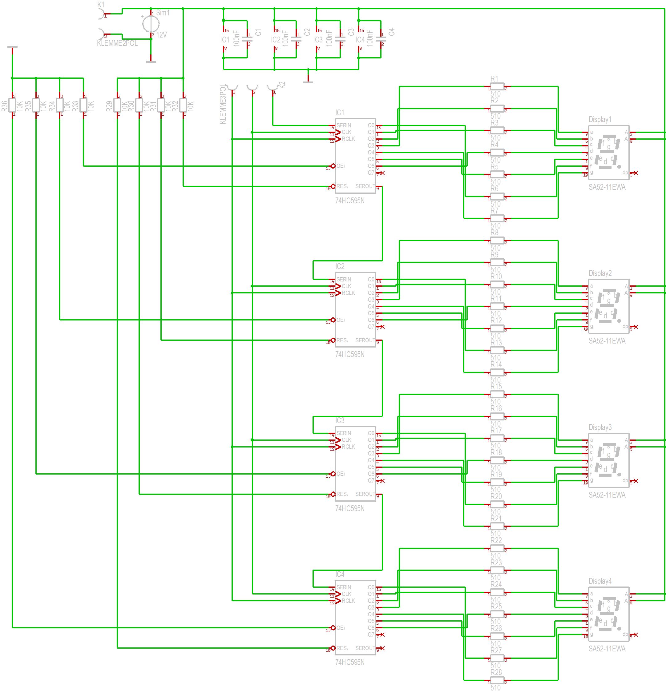 Hallo, was ist das für eine eigenwillige Beschaltung der 7Segment-Anzeigen? EIN Vorwiderstand für die ganze Anzeige?? Jedes Segment bekommt einen Widerstand, und die Anode geht direkt an Plus. Bei der jetzigen Beschaltung wird die Anzeige umso dunkler, je mehr Segmente angesteuert werden ... :-(