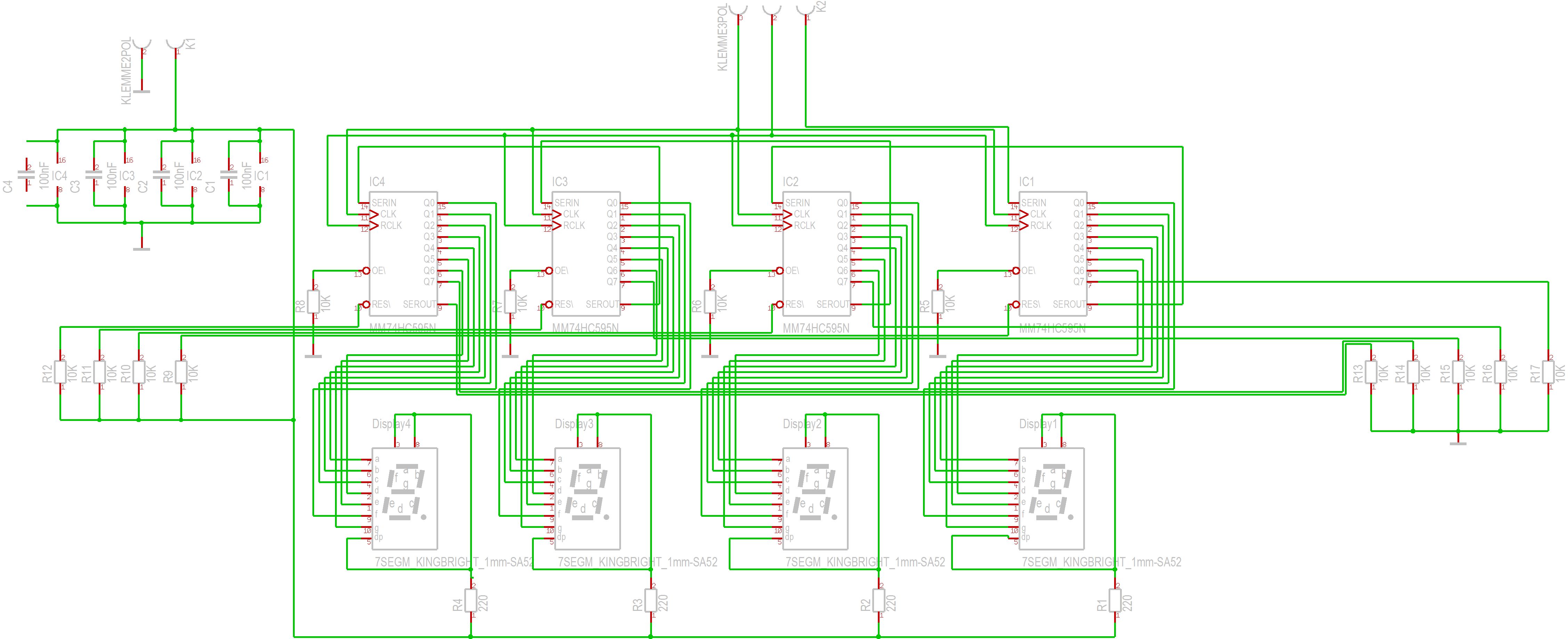 Schönen guten Abend, da es leider schon einige Zeit her ist als ich die letzte Platine zeichnete, und das Gedächtnis bisschen schwächelt, muss ich hier mal kurz nachfragen ob die Beschaltung wie im Schaltplan zu sehen ist stimmt. Speziell gehts dadrum: 7 Segmentanzeige: Pin 5 (dp) nicht benötigit, somit auf die Anode legen oder offen lassen? M74HC595N: Pin 13 (OE/): Mit oder ohne 10k Widerstand auf GND? (gezeichnet mit Widerstand) Pin 10 (Res/): Mit oder ohne 10k Widerstand auf Vdd? (gezeichnet mit Widerstand) Pin 7 (Q7) nicht vewendet, offen lassen oder auf GND? IC4 Pin 9 (Serout) nicht verwendet, offen lassen oder auf GND? Eigentlich ganz einfache fragen, und glaube auch dass ichs richtig gezeichnet habe xD, aber bevor ich die Platine ätze frage ich doch lieber nochmals nach. Vielen Dank schonmal im Voraus für die, die sich dafür kurz Zeit nehmen. Mit freundlichen Grüßen Hofei