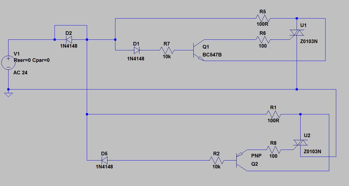 Hallo, Ich habe folgende Schaltung aufgebaut (siehe Anhang). Die Überbruckung über D2 soll eigentlich ein schalter sein... Es soll mit einer Wechselspannung von 24VAC wenn D2 nicht überbrückt ist, sprich der Schalter offen ist, U2 mit der negativen halbwelle geschalten werden. U1 sperrt. Dieser teil funktioniert soweit. Schliesst man jetzt den Schalter soll U2 nicht schalten, sondern U1. U2 sperrt nun. Ich müsste jetzt etwas dazuschalten, was wenn die pos. flanke erscheint U2 bei den folgenden negativen halbwellen sperrt. Und wenn der Schalter wieder geöffnet wird soll wieder U2 schalten usw. kann mir jemand einen gedankenanstoss geben, wie ich es realisieren könnte? (zur info: D2 und der Schalter dürfen nicht verändert oder ersetzt werden, alles andere ist frei veränderbar)