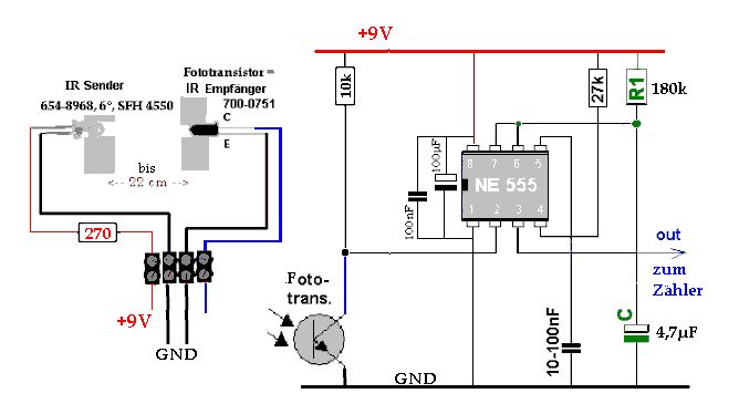 power ir led ir fototransi (mit tageslichtfilter 800...950nm) 1*cd4093b cd4026b uln2004 7 segmentanzeige gem. anode dazu noch etwas hühnerfutter und schon hast ne zählende lichtschranke. wenn der zählumfang größer als eine stelle sein soll dann halt mehrere cd4026 hintereinander schalten. dazu gehört dann auch jeweils der uln2004 als displaytreiber und die anzeige. der zähler kann nach 0 resettet werden und man kann die anzeige dukel scalten.