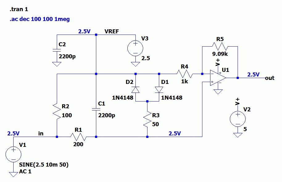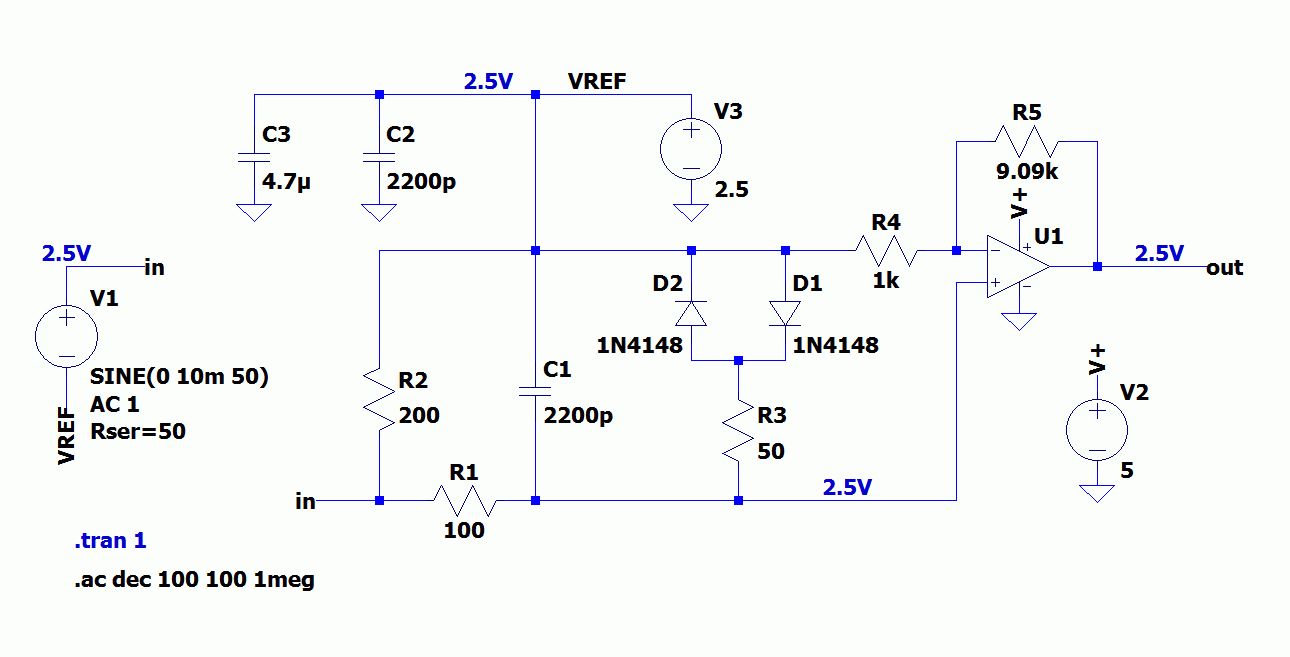Hallo , ich versuche gerade eine Bergrenzung schaltung zu verstehen und nachzusimmulieren . Der Zweck der Schaltung ist , ein Band von einem Signal abzuschneiden um die Oberwellen zu filtern . im Anhang ist die Originale Schaltung , sowie ein LT-spice Modell . -ist die V_ref die virtuelle Masse ? (Vref=5V) wenn so was stimmt ,wäre der Potential an der Ground dann -5V ? - wozu sind die Kondensatoren ? es ist ein Vorfilter ? -zu meine LT-Spice Simulation : wenn man die Eingang- und Ausgang plotet ,sieht man dass die die spannung am ausgang abgeschnitten worden ist , würde gern wissen , wie man die ober und untergrenze der Ausgangspanng auslegt -hängt es wahrscheinlich mit der Kennlinie der diode, wann sie durchschaltet? Danke im Voraus Gruß salo tajo