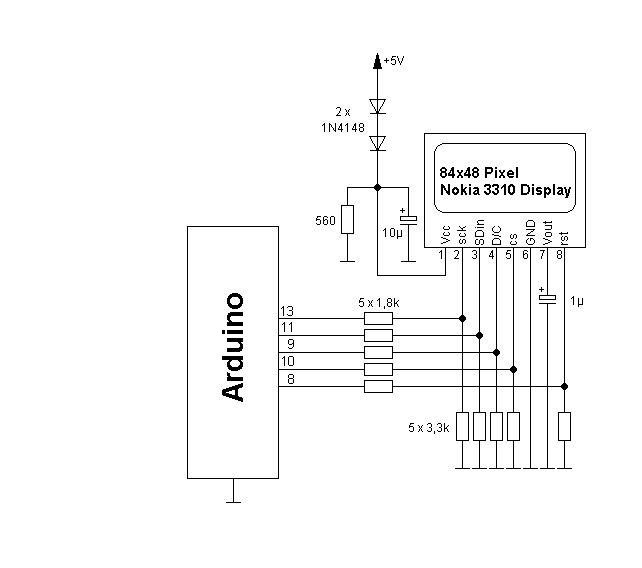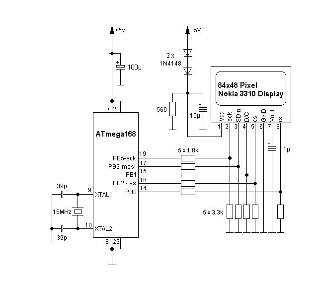Um es vorwegzunehmen: Normalerweise werkel ich NICHT mit einem Arduino. Allerdings ist der Bootloader des Arduino wirklich gut und für die Auszubildenden wurde deshalb ein ultrapreiswerter Arduino-Clone gebastelt der aus nichts anderem als aus einem (mit Transistoren aufgebauten) invertierenden Pegelwandler für die serielle Schnittstelle und einem ATmega168 besteht! Deshalb konnte ich den Anschluß eines Nokia Display's NICHT an einer originalen Arduinohardware testen (weil ich schlicht keinen originalen habe): Die beiden Schaltpläne (kann man so eine kleine Zeichnung Schaltplan nennen?) zeigen die Anschaltung des Displays an einen Arduino bzw. an einen ATmega168. Die Pinbelegung des Displays zum Arduino habe ich deshalb geändert, weil ich eine Platine so verdrahtet habe (meine C-Bibliothek bedient das Nokia Display über das Hardware SPI des ATmega). Die ersten Versuche die ich mit einem 3310 bzw. 3410 Display gemacht hatte, wurden auch über einen Pegelwandler von 5V auf 3,3V vorgenommen. Da es auch immer einen inneren "Wettbewerb" gibt, mit weniger Bauteilen auszukommen, wurden die Spannungen der Signalleitungen mit Spannungsteiler reduziert (das ist zwar nicht so richtig "schön", aber klein und sehr preiswert). Zum Arduino Code: Erst dachte ich, der Code könne nicht funktionieren, weil der Ascii - Zeichensatz nicht richtig gelesen werden könne, kann er aber ! Zuerst sah ich auf dem 3310 Display auch NICHTS ! Das lag allerdings bei meinem Display daran, dass nach einem LcdClear() der Adresszeiger des Displays dort verblieben ist und somit eine Ausgabe eines Textes NICHT im Adressbereich des Displays lag. Ein dem originalen Code hinzugefügtes gotoxy(char x, char y) setzt den Adresszeiger des Displays. Die Arduino-Datei hat bei mir (mit der Verschaltung wie in den Schaltplänen gezeigt) auf beiden Display's 3310 UND 3410 funktioniert! Sollte die Datei bei dir NICHT funktionieren, kann das eventuell auch noch daran liegen, dass es wirklich unterschiedliche 3310 Display's gibt, die unterschiedlich initialisiert werden müssen. Hier wirst du wohl im Internet schnell fündig werden. Einen Gruß, Ralph PS: würde mich über eine Rückmeldung freuen ob das so funktioniert hat