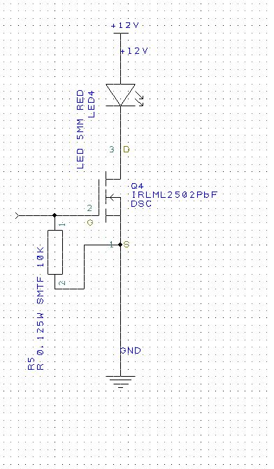 Guten Tag, liebe Foren-Leute... ich hab da mal paar Fragen zur Ansteuerung eines Logic-Level N-Kanal MOSFETs.. Kann ich mit der angehangenen Schaltung eine LED mit PWM Dimmen oder ist da noch irgendwo der Wurm drin? Signal vom uC kommt ans Gate, 10k-Widerstand ist als Pull-Down gedacht, LED ist nur n Dummy fürs PCB (später wird natürlich 1 - 20 LED mit jeweils passendem Vorwiderstand angeschlossen), zu hoher I-DS ist durch LED + Vorwiderstand ausgeschlossen, ansteuern wollte ich jetzt positiv... und jetzt die eigentlichen Fragen: 1. funktioniert das überhaupt so? 2. ist der Pull-Down nötig? 3. muss das Ausgangssignal vom uC invertiert werden (also ne 0 damit die lampe leuchtet)? 4. bekomme ich mit den Schaltgeschwindigkeiten Probleme bei dem FET? Ich hoffe ihr könnt mir helfen! Mit den MOSFETs steh ich auf Kriegsfuß ^^ LG Steffen