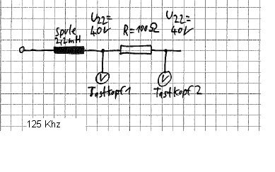 Hallo zusammen, ich habe folgendes Problem das ich nicht verstehe. Ich habe eine Spule und einen Widerstand in Reihe geschaltet. Wenn ich nun mit dem Oszilloskop die Spannung vor (Tastkopf1) und nach dem Widerstand (Tastkopf2) messe, dann habe ich an beiden Punkten 40V Spitze-Spitze. Wie kann das sein? Eigentlich müsste die Spannung nach dem Widerstand kleiner sein, da über dem Widerstand ja eine gewisse Spannung abfällt. Hängt das vielleicht mit der Frequenz zusammen? Die Spannung hat eine Frequenz von 125 Khz.