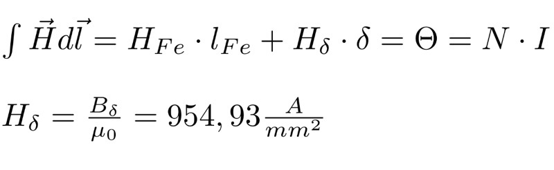 \oint \! \vec{H} \, \dd \vec{l} = H_{Fe} \cdot l_{Fe} + H_\delta \cdot