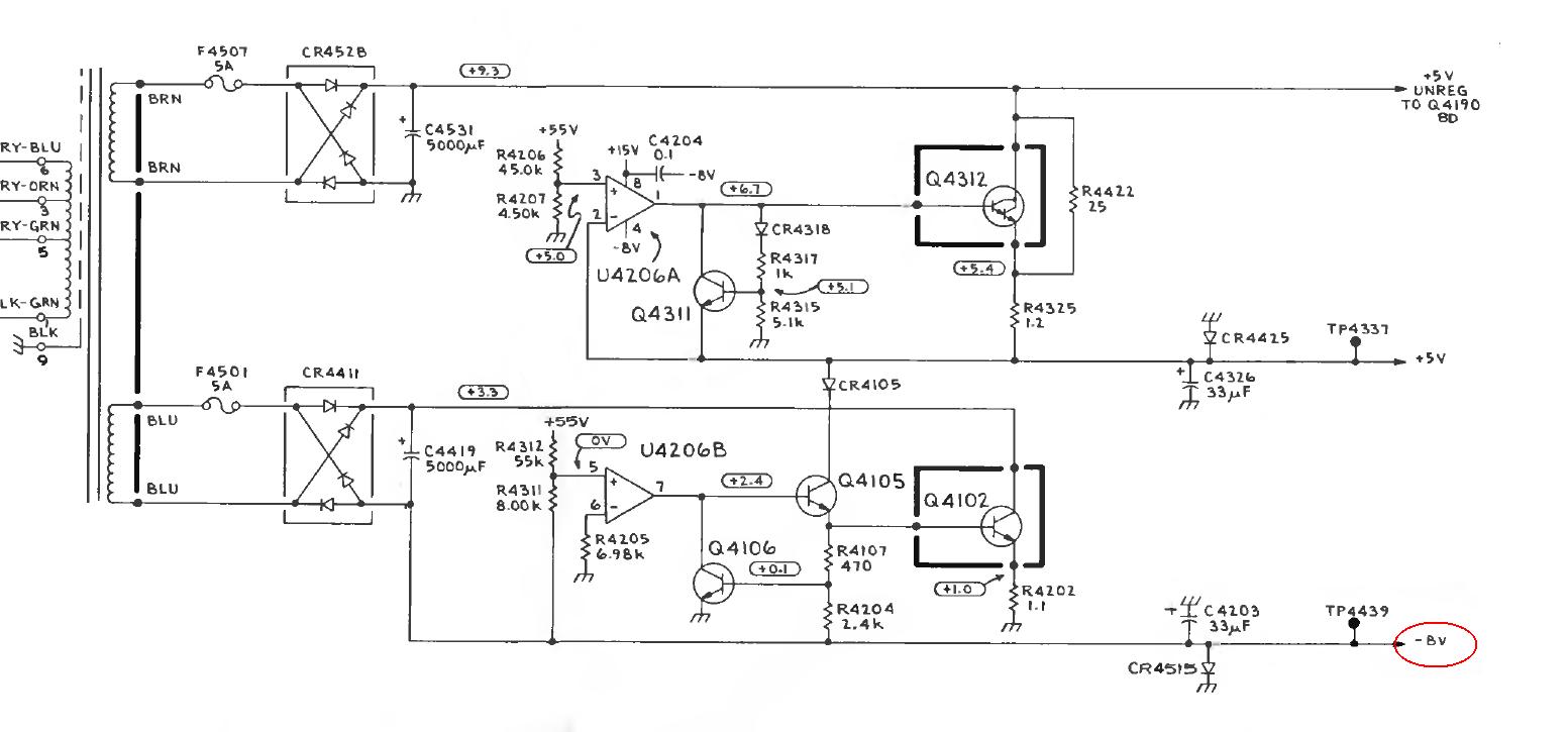 SWLer schrieb: > Wenn ich das richtig verstehe regelt er ja seine > eigenen -8V. Die -8v kommen direkt aus dem Gleichrichter, in der Leitung ist gar keine Regelung. Der Opamp regelt über Q4102 die Masse gegen die -8 Volt. Der Verdacht richtet sich auf besagten Q4102 und seine Ansteuerung. Über dem sollen ja so ca. 2,3 Volt liegen. Im schlimmsten Fall ist der Opamp futsch. Prüf auch mal, ob CR4105 auch noch ca. 4,3 Volt an den Kollektor von Q4105 liefert.
