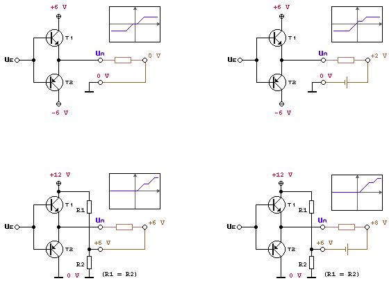 @ Peter Nun ja, auch lehrbuchschaltungen haben eine daseinsberechtigung, nämlich die, dass sie ein bestimmtes funktionsprinzip leicht verständlich machen, indem sie sich auf das wesentliche dieses prinzips beschränken. @ stephan >> in dem bild ist GND eingezeichnet, was dazu führt, das alle eingangsspannungen unterhalb 0.6V unterdrückt werden. lieg ich da richtig ? << Wie schon weiter oben gesagt, ist eigentlich die spannungsdifferenz zur ausgangsspannung entscheidend. Bei guten gegentaktverstärkern (natürlich "mit dioden") ist diese differenz sehr klein, und beim idealen stromverstärker ist sie null. Nehmen wir mal bei deiner zweiten schaltung einen simplen widerstand als verbraucher zwischen ausgang und masse. Der ausgang liegt dann im ruhezustand, also ohne eingangs- und ausgangsstrom, auf 0 V. Daher besitzen die spannungsdifferenzen die gleichen werte wie die spannungen (wegen Ue - 0 V = Ue), so dass man einfach die eingangsspannungen angeben kann. Wird der ausgang aber gegen ein anderes potential beschaltet, dann bedeuten z. b. 0.65 V spannungsdifferenz eine andere eingangsspannung, und der tote eingangsspannungsbereich verschiebt sich entsprechend. Blödes, aber wohl einleuchtendes beispiel: Man schliesse den verbraucher nicht direkt an masse, sondern an den pluspol eines 2 V-bleiakkus, dessen minuspol an masse liegt. Im ruhezustand ist dann Ua = 2 V. Die eingangsspannung kann zwischen ca. 1.35 V und 2.65 V machen, was sie will, ohne dass am akku viel passiert. Ue < 1.35 V ergibt Ua < 2 V, so dass der akku entladen wird, und Ue > 2.65 V ergibt Ua > 2 V, so dass er geladen wird. Etwas praxisnäher wird es, indem man den akku durch einen entsprechenden spannungsteiler ersetzt. >> also nach meinem gedankenexperiment kann die schaltung ohne negative spannungsversorgung gar nicht funktionieren. << Wenngleich eine symmetrische spannungsversorgung, z. b. -6 V und 6 V, für gegentaktverstärker wohl die elegantere wahl ist, funktioniert das prinzip ebenso mit einseitiger versorgung, etwa 12 V und 0 V. Das ist wie wenn man die spannungsversorgung komplett um eine hälfte (um 6 V nach oben) verschiebt. Der unterschied ist eigentlich nur, dass GND jetzt nicht in der mitte zwischen beiden versorgungsspannungen liegt (das wäre 6 V), sondern mit der einen "versorgungsseite" (0 V) direkt verbunden ist. Um gleiche verhältnisse zu schaffen wie im symmetrischen fall mit 2 V ausgangsbezugspotential, muss man den verbraucher nun an 8 V legen. Dieses potential könnte man z. b. - per niederohmigem (2/3)-spannungsteiler zwischen Ub und GND oder - mit vier bleiakkus gegen GND oder - mit einem bleiakku gegen niederohmigen (1/2)-spannungsteiler oder auch - mit zwei bleiakkus gegen Ub erhalten. Der tote bereich für die eingangsspannung läge dann zwischen 7.35 V und 8.65 V. Eine zwischen 1 V und 11 V schwingende sinus-eingangsspannung würde also bei 8 V stufen bekommen wie die auf deinem bild bei 0 V welche hat. Auf beiliegendem bild hab ich ein paar varianten aufgezeichnet. Die schaltungen würde man so nicht bauen, aber für's verständnis sollte's reichen. gruss zooloo