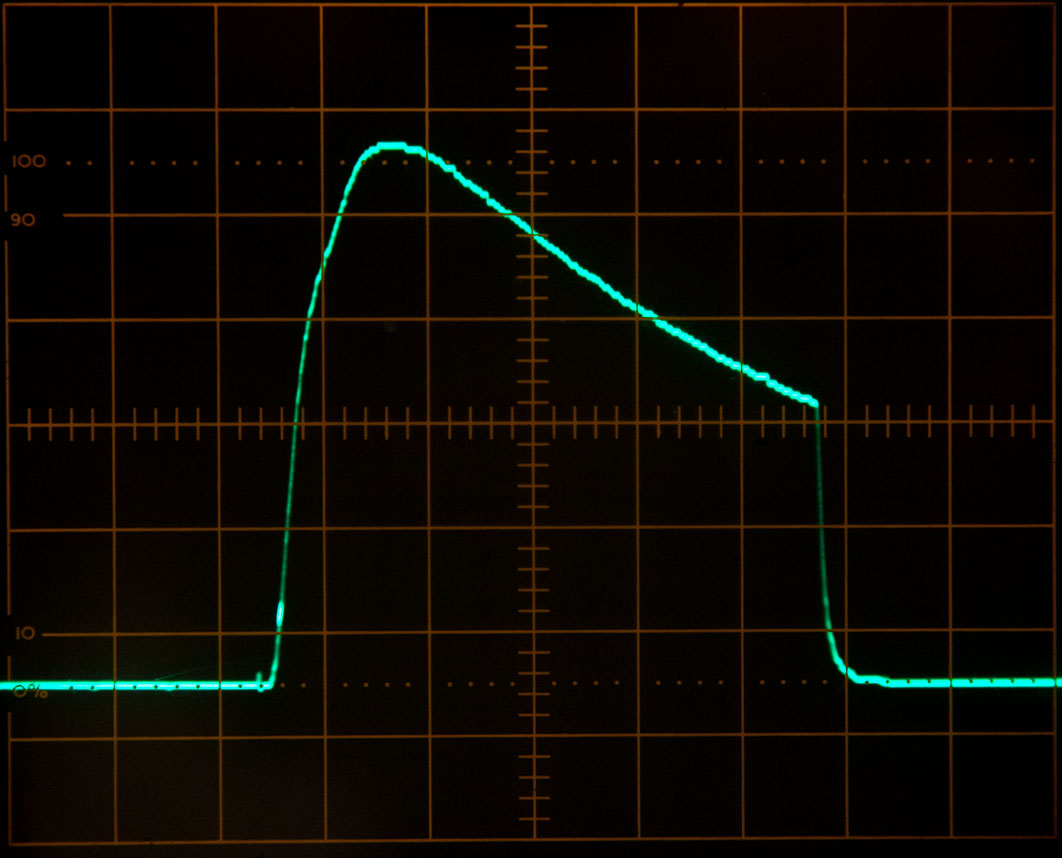 Ne LED hat irgendwo einen optimalen Arbeitspunkt. Sinnvollerweise da, wo der Chip dann ausreichend groß ist. Denkt an Uf und die quadratische Entwicklung des Die-Preises im Verhältnis zur Die-Fläche! Weiß jetzt nicht so recht was wirklich gefragt ist, aber moderne Blitzgeräte werden mit IGBTs gesteuert. Die Leistung wird über die Einschaltdauer des IGBT kontrolliert. Die obigen Kurven zeigen schön die Auslösung des Blitzereignisses und das Abklingen. Die Röhre geht ja lange Zeit nicht mehr von alleine aus. Der IGBT schnürt dann den Röhrenstrom irgendwann abrupt ab. Vor langer Zeit habe ich mal die maximale Modulationsfrequenz einer Blitzröhre mit einem kräftigen IGBT-ähnlichen Transistor getestet. Bei einer Disco-Röhre kommt man so auf ca. 1KHz. Schneller geht nicht, weil das Plasma doch kräftig nachleuchtet. Die Ionisationszeit ist erheblich länger, so daß man nicht nachzünden muß. Man schaltet den Strom einfach nur wieder ein. Leider waren die Transen damals nicht kräftig genug - so knackte es jedesmal etwas aus dem TO218 ;-) Der Strom war an die 200A.