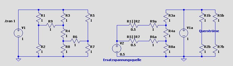 NicoO schrieb: > Normalerweise würde ich so vorgehen > das ich für R6 und R7 einen Ersatzwiderstand ausrechne den ich > beispielsweise R´ nenne. Aber da ich in diesem Fall ein Teil von R´ > zusammen mit R3+R4 noch mit R8 verrechnen muss und der andere Teil > direkt mit der Spannungsquelle verbunden ist weiß ich nicht wie ich das > machen soll. Genau da setzt die Umwandlung von Stern nach Dreieck oder andersrum an. Du nimmst Dir hier die drei Widerstände, die sternförmig zusammenlaufen und ersetzt diesen Schaltungsteil durch die äquivalente Dreieckschaltung. Wenn Du neu zeichnest, stellst Du fest, dass sich ein Teil der komplexen Schaltung nun in eine einfache Parallelschaltung geändert hat, deren Ersatzwiderstand Du wie gehabt bestimmen kannst. Die Neuberechnung der Werte steht hinter meinem oben beschriebenen Link ordentlich erklärt. Wird bei gleichen Widerständen natürlich besonders einfach. So kannst Du Dich Stück für Stück durch die Schaltung hangeln und kommst am Ende auf eine stark vereinfachte Lösung. Das ist langatmit und lästig, aber möglich. Knotenpotentialverfahren ist für Dich wahrscheinlich noch Overkill, aber sicher auch eine praktikable Lösung.