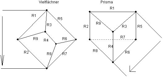 Prisma? Was für ein Prisma? Es gibt verschiedene Prismen mit unterschiedlicher Kantenanzahl. Unter anderem einen Würfel oder etwa die in Ferngläsern verwendeten, die wesentlich komplexer sind. Das häufig zu Lehrzwecken verwendete wird im ersten Bild im Wikipedia-Artikel gezeigt. http://de.wikipedia.org/wiki/Prisma_%28Optik%29 Das aber hat zehn Kanten und eine so geformte Widerstandsanordnung hätte demnach zehn Widerstände. In Deiner Schaltung sehe ich aber nur neun. Der Artikel zeigt noch mehr "Prismen": http://de.wikipedia.org/wiki/Prisma_%28Geometrie%29 Ehe man davon ausgeht das ein Individuum der einzige Vertreter seiner Klasse ist, sollte man mal googeln. :-) Der korrekte Weg wäre die Nennung des Poyleders. So fängt's schon mal an. Dann können wir auch das Ersatzschaltbild beurteilen.