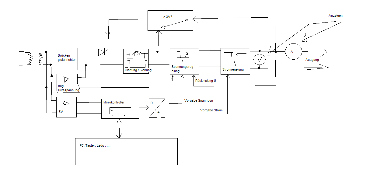 Hallo, ich will mir ein Labornetzteil mit regelbarer Spannung und Strom bauen. Es soll auf 0-12V und 0-3A einstellbar sein. Ich will das ganze mit einem Mikrocontroller steuern, also ohne Potis direkt in der Regelschaltung. Die Spannung bzw. Strom soll also vom MC über einen DA-Wandler an den analogen Regelkreis vorgegeben werden. Den Spannungs- bzw. Stromregler würde ich gerne diskret aufbauen. Zusätzlich um die ganze Kiste effizient zu machen, wollte ich die Spannung mit einer Phasenanschnittsteuerung grob vorregeln. Meine Frage währe ob das vom Prinzip her so hinhauen kann wie ich mir das vorstelle, bzw. ob das sinnvoll ist. Ich hoffe man was im Bild erkennen.