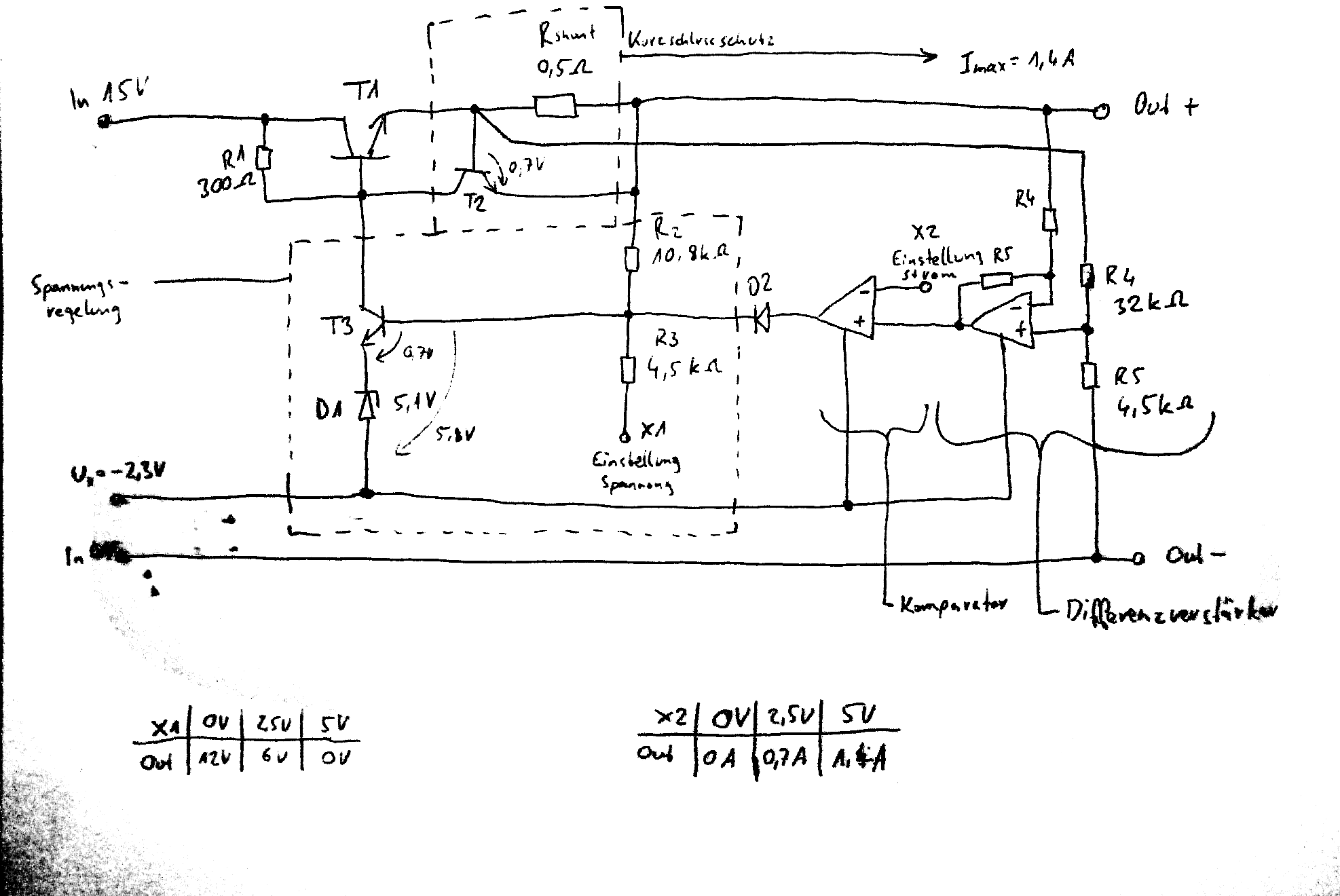 Ähnlich wie das was du bauen willst: http://www.avrs-at-leipzig.de/dokuwiki/projekte/labornetzteil (10nF an Q4 sicher falsch, D3/D4 als 1N4004 fehldimensioniert) Mehr Leistung: http://www.elektronik-kompendium.de/forum/forum_entry.php?id=139305&page=0&category=all&order=time Noch mehr Leistung: http://cp.literature.agilent.com/litweb/pdf/5964-8275.pdf Es hat schon seinen Grund, warum die so viele Teile verbauen.