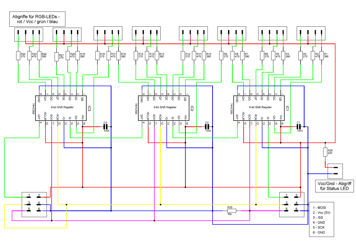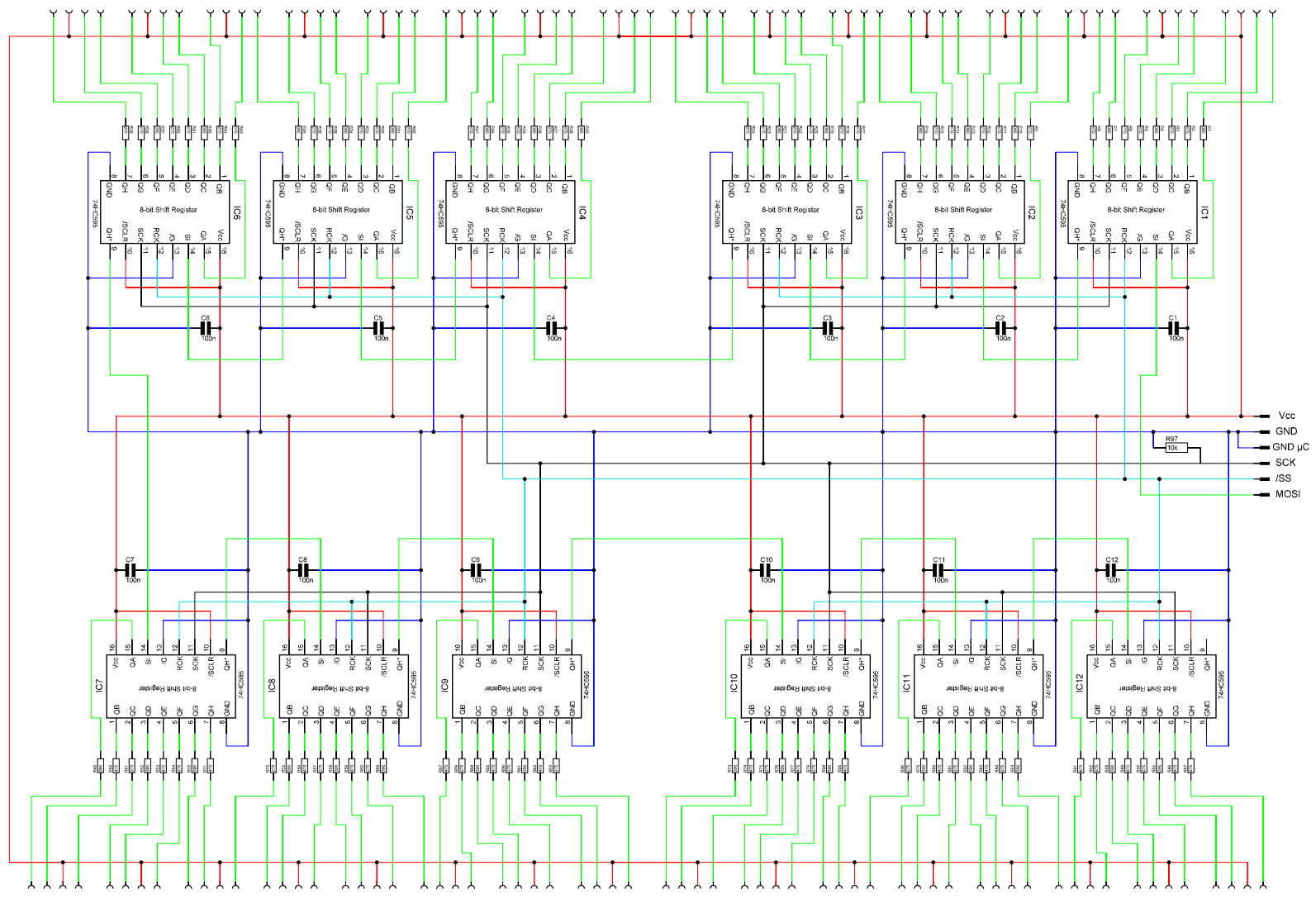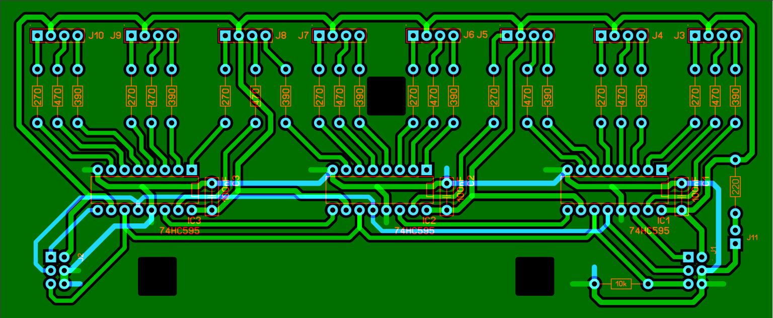Hallo Forum, ich möchte euch bitten mal über das Platinenlayout zu schauen und mir verbesserungs Vorschläge zu geben bzw. Anmerkungen zu machen ob das so Funktioniert oder wo ihr da Probleme seht. :) Zu der Schaltung: Es ist angedacht das ein PC Daten an einen µC sendet, der µC wertet die Daten aus und steuert dann über SPI die Shiftregister an. An den Ausgängen der Shiftregister werden dann 4-Polige RGB-LEDs angeschlossen. Die Testschaltung funktioniert und nun geht es darum das ganze auf mehrere Platinen auf zu teilen. Die Schaltung umfasst 32 RGB-LEDs und 12 Shiftregister (74HC595). Die Schaltung soll auf 4 Platinen aufgeteilt werden, also pro Platine 8 LEDs und 3 Shiftregister. Die Platinen will ich dann bei LeitOn ( http://www.leiton.de ) zur Fertigung in Auftrag geben. Das Layout ist so gehalten das ich 4 mal die gleiche (oder die selbe?) Platine bestellen kann, und nicht eine Anfangsplatine, eine Endplatine und zwei Mittelplatinen. Die Aufteilung der Schaltung auf mehrere Platinen findet primär aus Platzgründen statt. Es ist angedacht das dann im praktischen Aufbau 2 Platinen nebeneinander und 2 Platinen übereinander sind und über 6-Polige Kabel verbunden werden. Die LEDs werden an die 4-Poligen Stiftleisten angeschlossen. Die größe der Platine ist relativ Fix und beträgt momentan 146mm x 60mm. Zum Layout: Durchmesser Lötpad : 2mm Durchmesser Bohrloch : 1mm Leiterbahnbreite Vcc/GND : 1mm breite anderer Leiterbahnen : 0,8mm Abstand Leiterbahn zu Kupfer : 0,5mm µC Frequenz : 16MHz Der PC schickt nicht so oft Daten zum µC womit die LEDs auch eher selten geschaltet werden, wenns ganz hart kommt vielleicht 4-mal in der Sekunde. Die Speerflächen sind später für die Befestigungs-/Abstandsbolzen. Als Software für Schaltplan und Layout benutze ich sPlan7 und SprintLayout6. Und dann habe ich auch gleich noch eine Frage: Sollte ich auf der Platine noch 100nF Kondensatoren für /SCLR vorsehen? Als Spannungsversorung kommt ein 5V Netzteil zum Einsatz. Netzteil: http://www.reichelt.de/Schaltnetzteile-Case-geschlossen/SNT-MW25-05/3/index.html?;ACTION=3;LA=446;ARTICLE=57465;GROUPID=4959;artnr=SNT+MW25-05;SID=10UQdyH38AAAIAAHjQCcob6657228873f5d1bb0e4d420c9dc7e9d LEDs: http://www.highlight-led.de/bauelemente/leuchtdioden/led_5mm_mehrfarbig_/_blinkend/10_leds_5mm_wasserklar_rgb_4-polig_steuerbar_set_i16_316_0.htm So, ich hoffe ich habe euch alles gegeben was Ihr braucht um das Layout Bewerten zu können. Wenn Ihr noch mehr braucht, bescheid sagen, ich werde die fehlenden Informationen dann schnellstmöglich nachreichen. Ich hoffe Ihr könnt mir helfen. :) Grüße