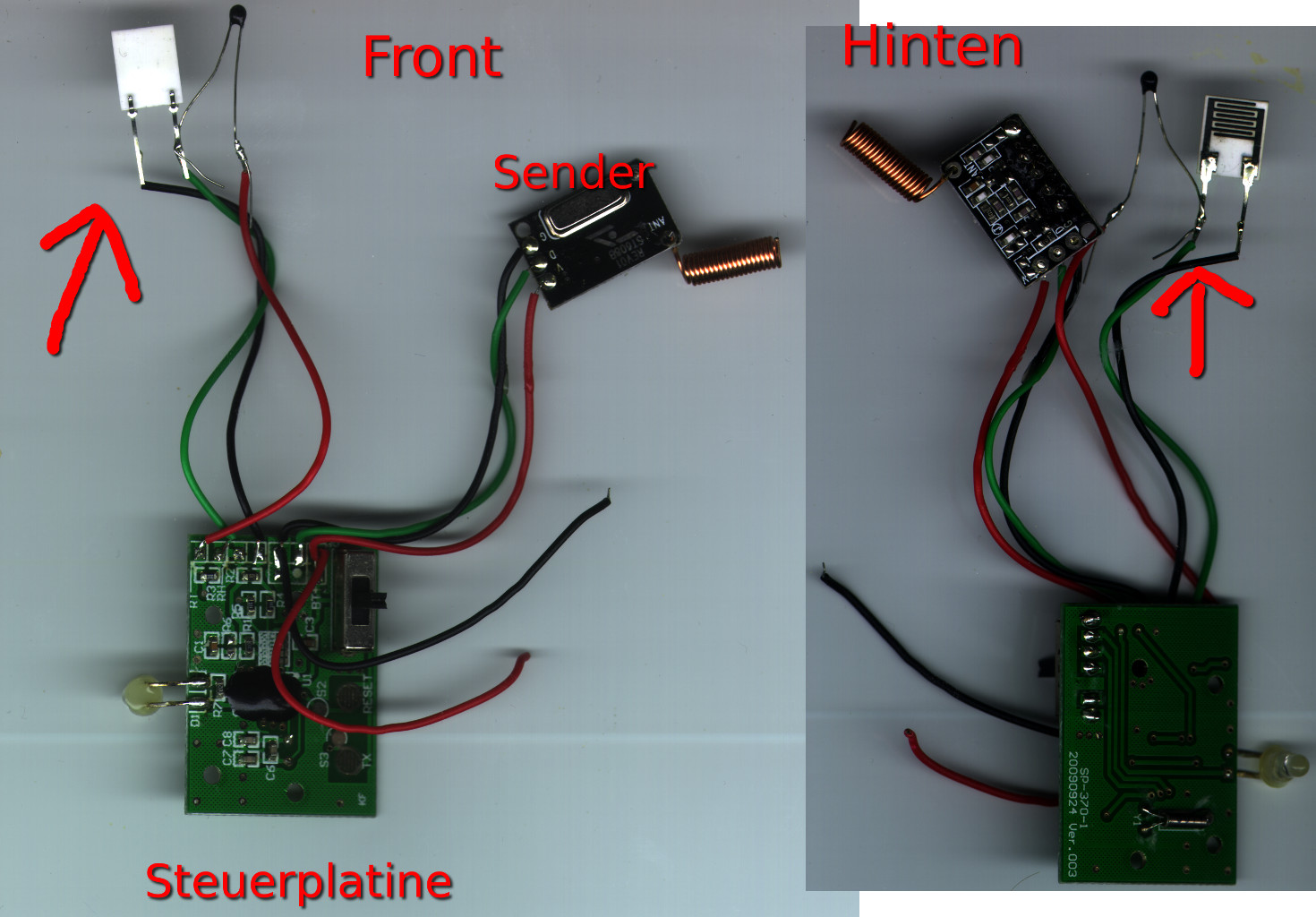 Hallo zusammen, nach dem meine Tschibo Wetterstation kaputtgegangen ist, wollte ich mir den Außensensor greifen und schauen was ich davon noch verwenden kann. (Siehe Bild im Anhang) Wo ich aber nicht weiterkomme sind folgende zwei Fragen. 1. Meint Ihr ich kann den Sender auch mit 5V beheizen ? (Vorher warens 2x1.5V Batterien) 2. Der Pfeil zeigt ja auf die Sensorik ... Das eine müßte meiner Meinung nach Feuchtigkeit und Temperatur sein - wieso hängen die zusammen ? Wie kann ich diese(n) Sensor(en) ansteuern ? Danke schonmal im Voraus