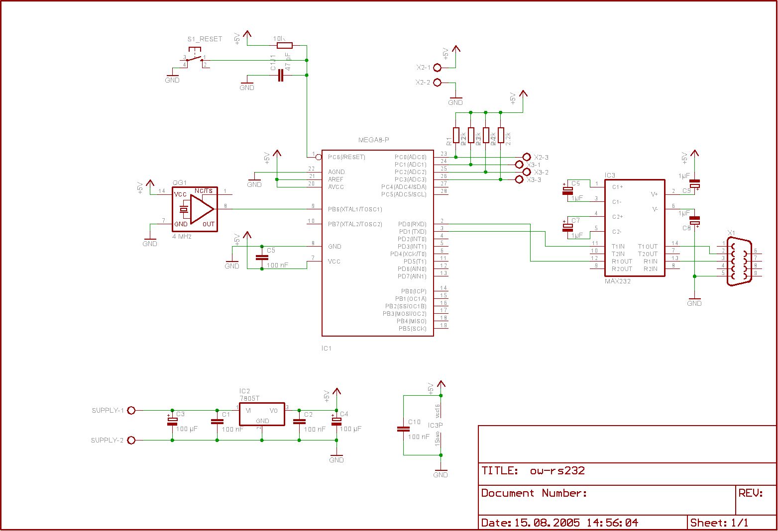 Hallo! Ich habe versucht (siehe Anhang) eine Schltung zu entwickeln mit der ich DS18x20-Sensoren (OneWire-Bus) in meine Computer einlesen kann. Da ich nicht viel von Hardware verstehe wäre es toll, wenn Ihr euch die Schaltung mal ansehen könntet. Nicht das es irgendwelche Überraschungen gibt, wenn ich die Schaltung zusammengebaut habe. Danke, Sascha