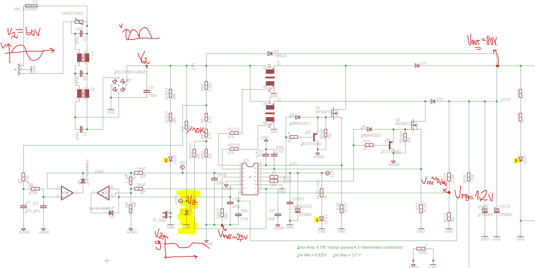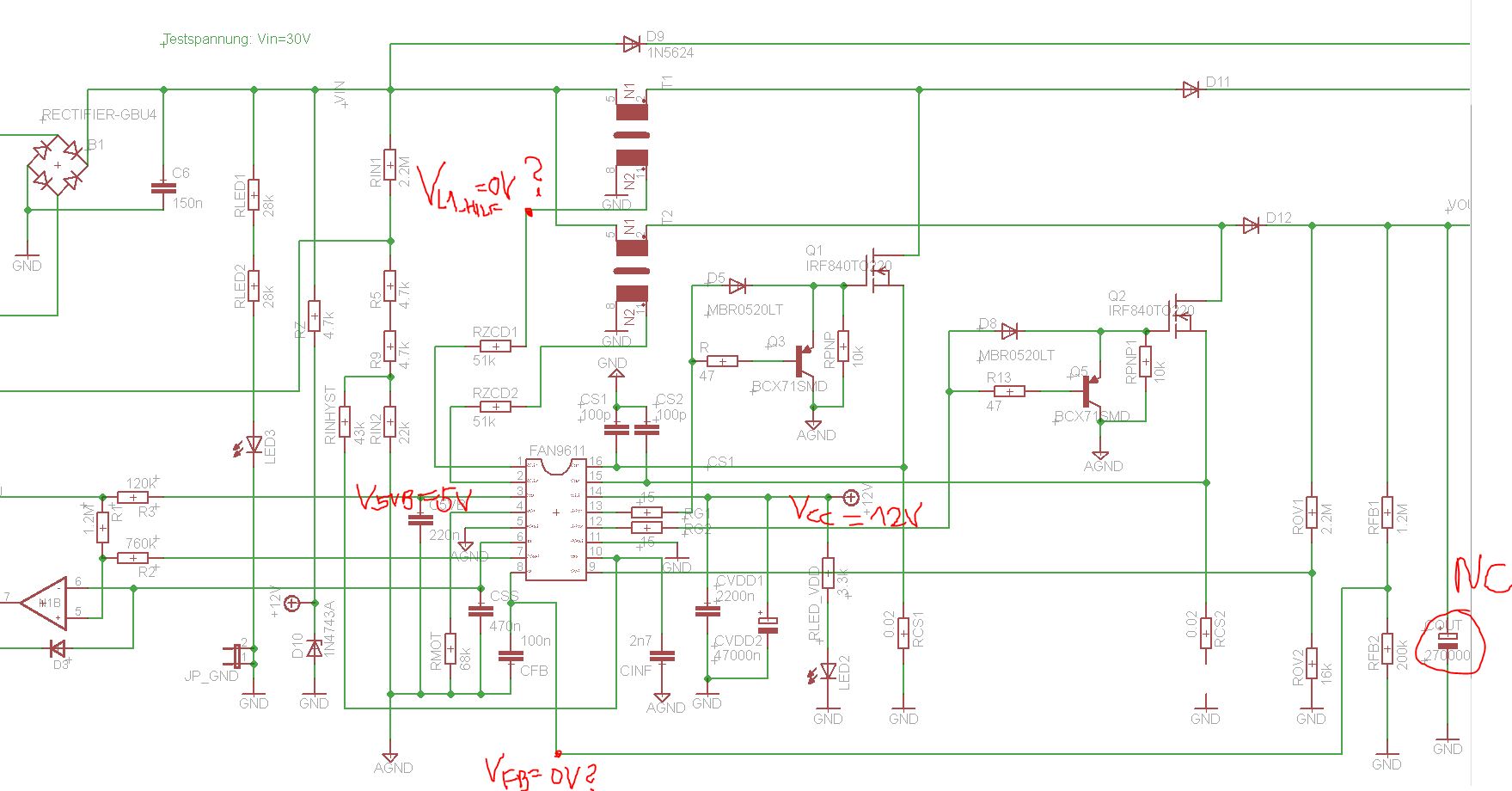 Hey ihr beiden, Klar ist das nicht die Freilaufdiode, tud mir leid hab ich auf der schnelle beim schreiben iwie nicht wirklich mitgedacht. Also meine Freilaufdiode ist eine S4J: Ir=4A, Uv=600V (SMC von Fairchild Semicoductor) Ich hab euren Rat jetzt befolgt und die komplette Schaltung (also den zweiten Pfad + Cout) aufgebaut, das Problem scheint jetzt die Z-Diode zu machen-> ich kann keine konstanten 12V VDD-Pin vom IC messen, bei ca. 9V bricht die Spannung auf 7V ein, dadurch bekomm ich am 5VB- Pin nur Pulse und keine konstante 5V (die ich für die Versorgung des OPV brauche) Ansonsten liegen an den Spannungsteilern alle Spannungen auch richtig an(FB,MOT,OVP,VIN)