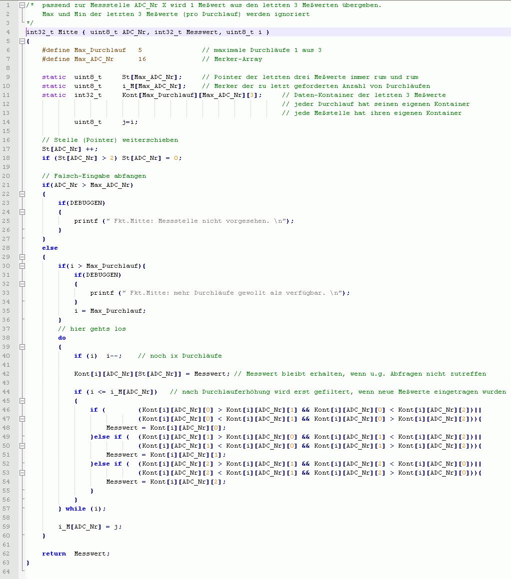 PT1-Filter: #define filterStaerke 6 int32_t tmpSum; tmpSum += (tmpSum >> filterStaerke) + tmpInput; tmpSum steigt dann auf das 2**filterStaerke-fache von tmpInput an, deshalb auch 32bit.
