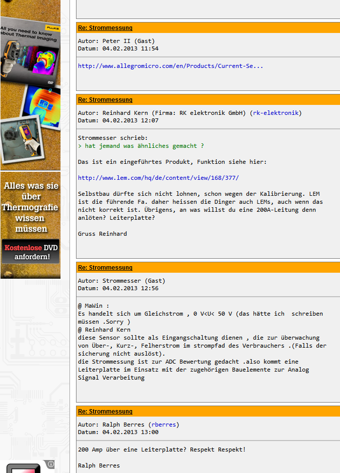 Patrick W. schrieb: > Ralph Berres schrieb: >> 200 Amp über eine Leiterplatte? > > Klar kein Problem, das Forum bzw. die Google Anzeigen werden immer > besser und schlagen dazu schon das passende Messgerät vor! > Siehe Anhang ;-) Funktioniert das Messgerät auch noch bei Rotglut? Gruss Harald PS: Aus der Temperatur müsste man doch problemlos den Strom errechnen können. Dann braucht man auch keinen Stromsensor mehr.