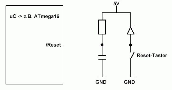 @Karl: Ich bin kein Hellseher, ging aber davon aus, dass es sich um die Schaltung handelt, die zu AT90S1200-Zeiten Standard war. Das Schaltbild hätte ich mir sofort angesehen, wenn es in einem browserfreundlichen Format (z.B. GIF) gewesen wäre, also nicht erst der schwerfällige PDF-Reader geladen werden muss. Inzwischen habe ich mir die Schaltung angesehen, es ist die, die ich auch meinte, ich bin aber trotzdem kein Hellseher. Die Diode dient eindeutig dazu, den Kondensator beim Abschalten der Betriebsspannung zu entladen. Einerseits, um den MC zu schützen, andererseits, um nach Spannungseinbrüchen bzw. schnellem Widereinschalten ein Reset-Signal zu generieren. Dies war bei den alten Classic-AVRs ein billiger Ersatz für einen externen Resetbaustein. Die meisten heutigen AT-Tinys und AT-Megas haben aber bereits eine vernünftige Reset-Schaltung (incl. BOD) integriert. Sie brauchen solcherlei Schaltungen nicht. Leg' einen Widerstand von 3,3k...10k zwischen Reset und Vcc und gut ist. Ist die Umgebung des AVRs elektrisch verseucht, dann mach den Widerstand etwas niederohmiger, damit der Reset-Pin nicht als Antenne wirken kann. ...