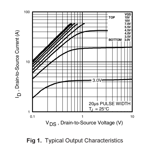 Wie ist den die Angabe des R_DS_ON zu verstehen ? z.B. IFR7413 R_DS_ON = 11mOhm Wenn man sich das Ausgangskennlinienfeld betrachtet (siehe Anhang), hat man doch zum Beispiel bei U_GS=3V; I_d = 4A; U_DS = 0,5 V Daraus folgt R_DS_ON = 0,5/4 = 125mOhm ... ? Konkret: Ich will mit ihm als Schalter 6 Ampere DC schalten und sperren. Frequenz<0,001Hz... Wie groß ist der Widerstand wenn der MOSFET leitet und wieviel Kühlleistung muss ich demnach abführen ? (P=11m*6A^2=0,396 ? Warum ?) Danke !!