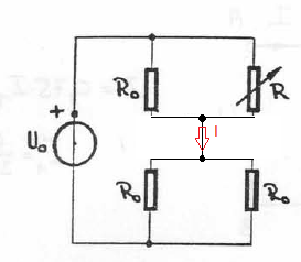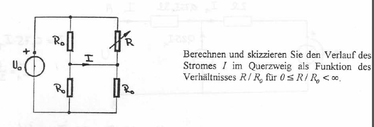 nach deiner Formel könnte der Strom nur in eine Richtung fließen, was wohl nicht so ganz richtig sein kann. (Stell dir dazu nur mal die Extreme R0=0 und R0=unendlich vor) Mein Vorschlag: denke dir den linken Spannungsteiler als eine Ersatzspannungsquelle mit Uq1 = U0/2 und Ri1 = R0/2 mach das selbe für den rechten Spannungsteiler, wobei Uq2 und Ri2 vom variablen R abhängen (rechnen darfst du selbst). Wenn du jetzt beide Ersatzspannungsquellen zusammenschließt, fließt der Strom (Uq1-Uq2)/(Ri1+Ri2). Sein Vorzeichen hängt vom Vorzeichen der Differenzspannung ab.
