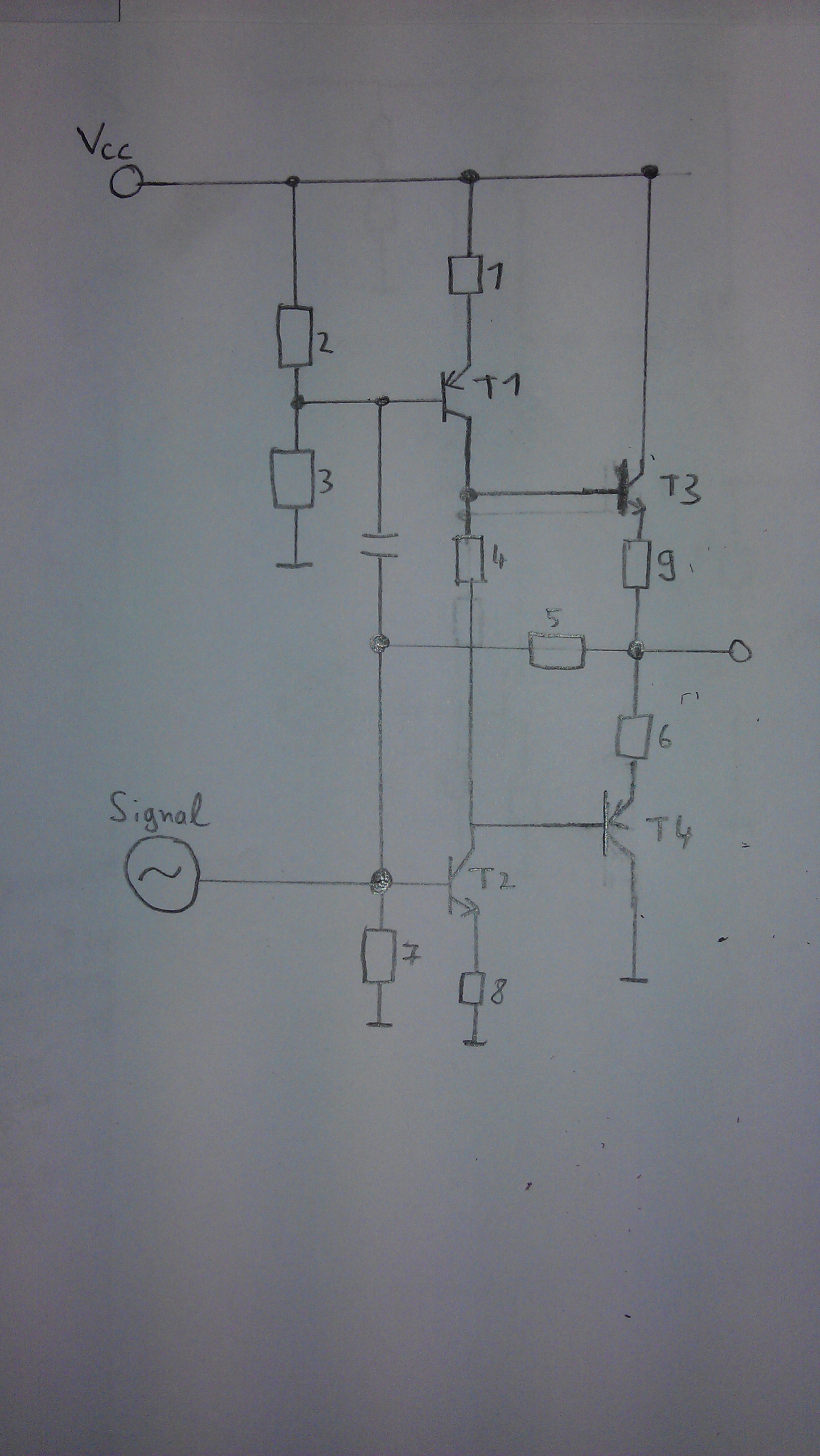 Hallo Zusammen! Ich bin neu hier. Ich bin 19 Jahre alt und habe gerade eine Lehre als Elektriker in Stuttgart angefangen. Ich finde das Gebiet der Elektronik einfach faszienierent. Als hobby baue ich zur Zeit einige Tranistorenschaltungen auf! Doch nun habe ich eine Schaltung gefunden, die ich nicht wirklich verstehe! Ich weiß das ich noch lange kein Fachhmann auf diesem Gebiet bin, aber ich versuche mich anhand vieler Beispiel Schaltplan einfach zu verbessern! Da mein Pc im Moment leider im Kaputt ist kann ich keinen Schaltplan mit pSpice anhängen.... Ich habe die Schaltung deshalb mit Bleistift gezeichnet! Ich bin einfach neugierieg wie die Schaltung genau Funktioniert! Leider waren keine weiteren Angaben dabei, deshalb tue ich mir sehr schwer!! Swoeit ich das jetzt verstanden habe, arbeiten T1 und T2 als Gegentakttransistoren und verstärken das Signal. T2 für die negative und T1 für die Positive welle oder?? Mit R2,3 stellt man den arbeitspunkt ein. T3 und T4 bilden die Endtsufe. Stimmt doch oder?? Doch wie verlauft das Signal nun genau?? Für was dient R4 R5 R7?? Würde mich über jede Hilfe freuen!! MFG Paul