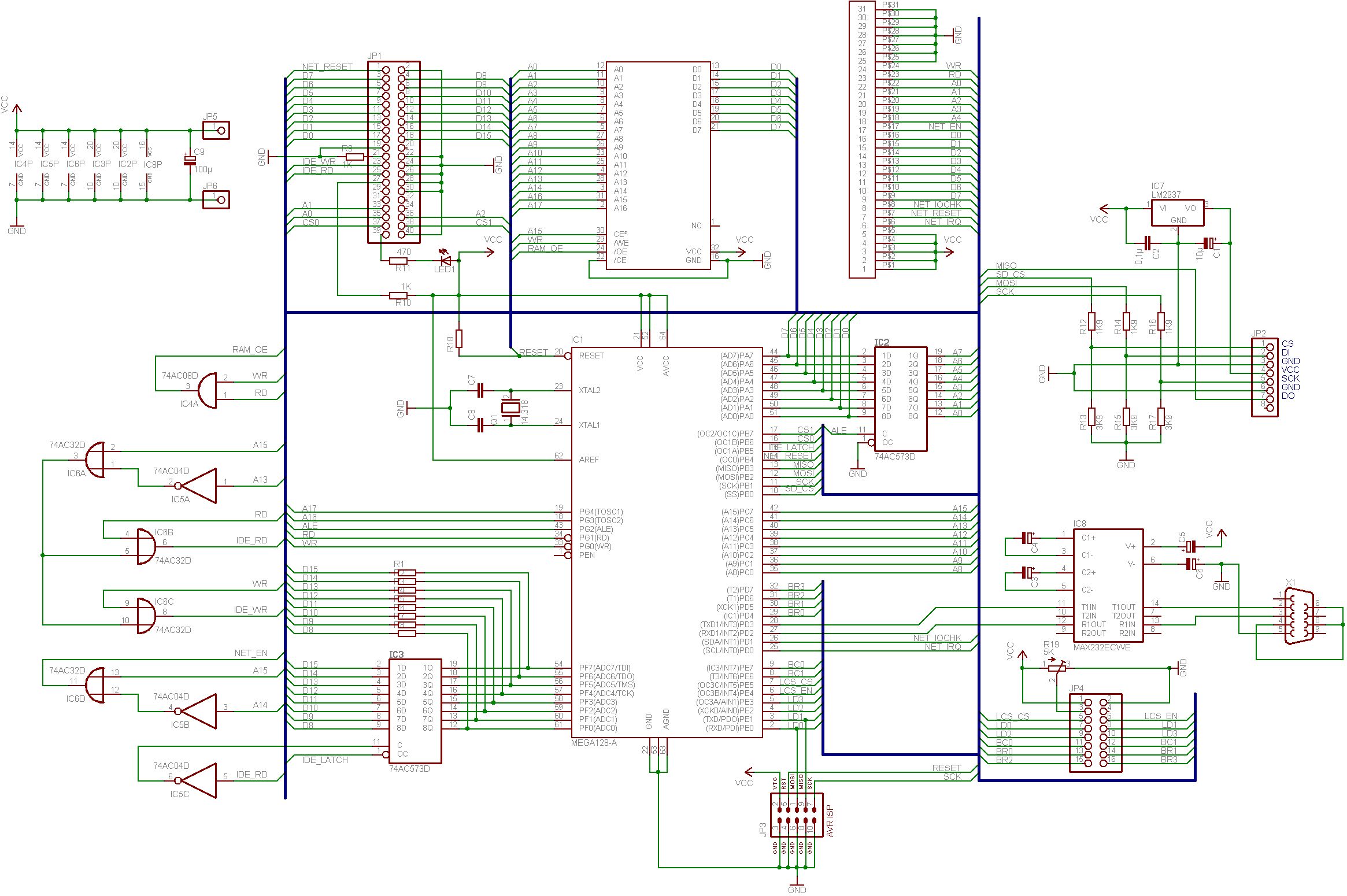 Hallo. Könntet ihr euch bitte diesen Schaltplan etwas anschauen ? Ist mein erstes Projekt dieser etwas komplexeren Art und ich möchte einfach nur auf Nummer sicher gehen, bevor ich das Ding aufbaue. Das ist ein Webserver, der zugleich ein IDE und SD-Interface bieten soll. Weiter Features sind 128KB Banked RAM, der auf den Addressen 8000-FFFF des Ext. Busses liegt, ein LCD und eine kleine Tastermatrix, die auf dem LCD integriert sind und ein RS232-Interface. Die Netzwerkkarte soll mit dieser Logik über die Addressen 4000-5FFF angesprochen werden, die Festplatte von 2000-3FFF. Der Bereich 6000-7FFF würde sowohl Festplatte als auch Netzwerkkarte addressieren, daher möchte ich diesen der Einfachheit halber als "Reserved" lassen. Die Platine geht erst an eine Adapterplatine, sodass das Pinout des 31 pol. Verbinders oben links NICHT das einer ISA-Netzwerkkarte ist. R1-R8 (unten links) haben einen Wert von 10K-Ohm. Worauf müsste ich beim Layout (zweiseitige Epoxyd-Platine, 80x100)besonders achten ? Vielen Dank für alle Verbesserungsvorschläge !