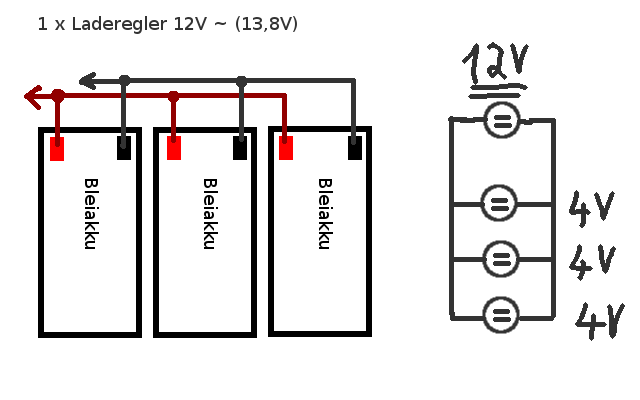 Hallo Forum, ich habe da mal eine Frage. Ich möchte Bleiakkus (Wartungsfrei) zusammen schalten. Die Bleiakkus die ich verwende haben alle 12V Akkus bei 7Ah, diese sind von Conrad, der Link ist am Ende zu finden. Dabei möchte ich 3 Bleiakkus parallel schalten. Mit LED's oder anderen Verbrauchern ist mir das klar aber bei solch großen Akkus habe ich ein bissen Respekt. Ich möchte nicht das die ausgasen oder gar explodieren. In dem beigefügten Schaltbild habe ich die Akkus parallel geschaltet, normalerweise würde dann jeder Akku nur 4V Spannung führen und die Kapazität würde sich addieren, wie bei Kondensatoren. Jetzt meine Frage ist das Sinnvoll oder ist das Blödsinn die Akkus parallel zu schalten und geht das überhaupt ohne die Akkus zu zerstören? Ach ja ich möchte die Akkus parallel schalten, weil ich nur einen Laderegler verwenden möchte. Bleiakku - http://www.conrad.de/ce/de/product/250202/Conrad-energy-Wartungsfreier-Blei-Akku-12-V-7-Ah-48-mm-Flachstecker-Blei-Vlies-B-x-H-x-T-151-x-95-x-65-mm-CE12V7Ah-B#