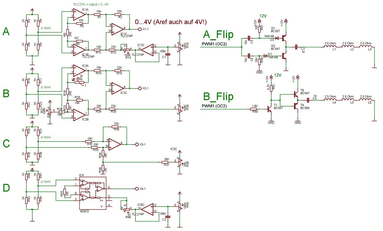Hallo, ich hätte gleich zwei Fragen an Euch: 1.: Ich möchte die Spannung(10mV) eines Hall-Sensors(KMZ51) verstärken. Es handelt sich bei dem Sensor um eine Brückenschaltung, für dessen Verstärkung ich mehrere Schaltungen gefunden habe (siehe Anhang). Wenn nicht unbedingt nötig möchte ich auf eine negative Versorgungnsspannung verzichten. Variante A benutzt ein TLC274(optimized for single-supply operation) dessen Spannungsbereich in etwa bei 0..4V liegt. Variante B stammt aus dem Datenblatt des Sensors. Ich benötige jedoch keine Temperaturkompensation. Variante C is ein einfacher Differenzenverstärker mit Offset Spannungs abgleich. Variante D verwendet einen AD623 Instrumentenverstärker, der jedoch um einiges schwerer zu beschaffen und auch teurer sein wird, wie der TLC274. Welche Schaltung würdet Ihr für diesen Sensor empfehlen? 2.: Der KMZ51 besitzt laut Datenblatt(http://www.semiconductors.philips.com/acrobat_download/datasheets/KMZ51_3.pdf) eine Flipping-Spule mit 1..3 Ohm Widerstand. Auf dieser Spule sollen kurze Stromimpulse von bis zu 2.8A erzeugt werden(http://www.volny.cz/vopalem/Publications/Eurosensors/AMR.pdf). Variante A_Flip ist an eine Operationsverstärker-Schaltung aus dem Datenblatt angelehnt (http://www.semiconductors.philips.com/acrobat_download/various/SC17_GENERAL_MAG_98_1.pdf Seite 24). Ich bin mir nicht sicher, ob ich an den Eingang der Schaltung den 5V Port eines µC anschliessen darf, weil ich die Schaltung nicht (ganz) verstanden habe. Variante B_Flip ist eine Eigenkreation, welches wahrscheinlich so nicht funktionieren wird. Falls die Schaltung "B_Flip" so nicht korrekt ist, wie muss ich sie dann ändern, um den Eingang sicher mit 5V betrieben zu können? Danke und Gruss, Zoltan