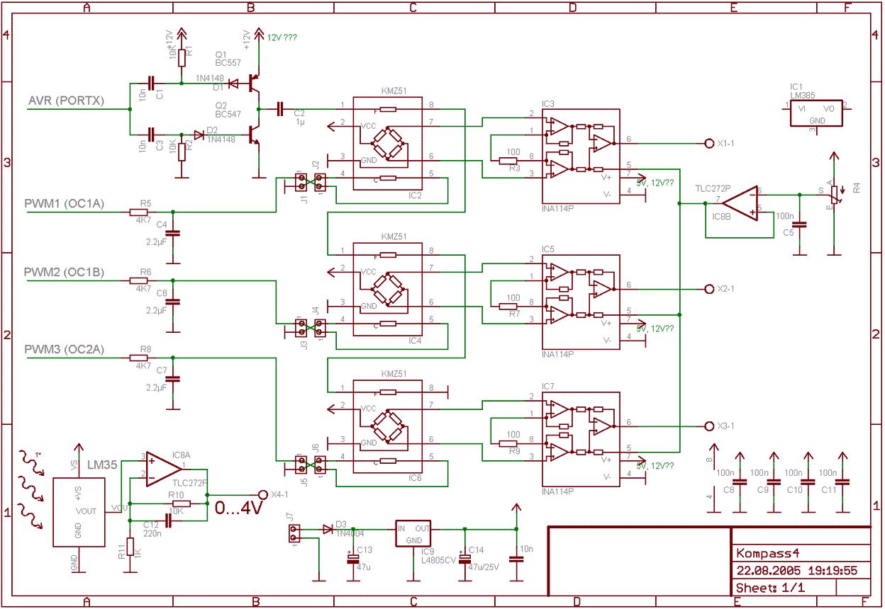 Hallo Zoltan Ich empfehle Dir die Schaltung von http://www.semiconductors.philips.com/acrobat_download/various/SC17_GE... zu nehmen. Die verwendete Methode eine Strom in den Spulen zu erzeugen und diesen Strom so Einzustellen daß das zu messende Magnetfeld neutralisiert wird funktioniert bestens und durch das Flipping werden auch die Offsetspannungen ausgetrickst. Ich habe damit einen Kompaß gebaut und konnte auf ca 1 Grad genau messen. Das Ausgangssignal teilst Du einfach mit einem Spannungsteiler gegen Minus durch 2 und verwendest eine 10 Volt Versorgung für die Schaltung und eine 5 Volt Versorgung für den Prozessor der die Signale auswerten soll. Beide Minus der Versorgungen werden verbunden. Damit hat das Signal zum Prozessor nur noch ca 0...5Volt.